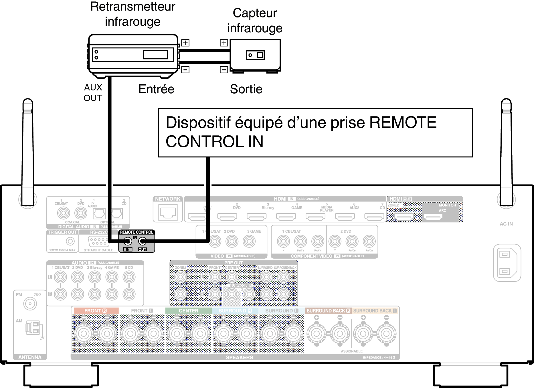Lorsque cet appareil est installé dans un endroit où les signaux de la télécommande ne peuvent pas atteindre (installation dans un placard, etc.), il peut toujours être contrôlé par la télécommande en connectant un récepteur de télécommande (vendu séparément).