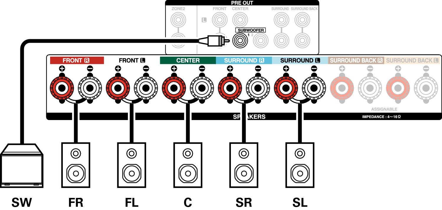 Cette méthode de connexion construit un système d’enceinte à canaux 5.1 dans la MAIN ZONE et un système à 2 canaux dans la ZONE2.