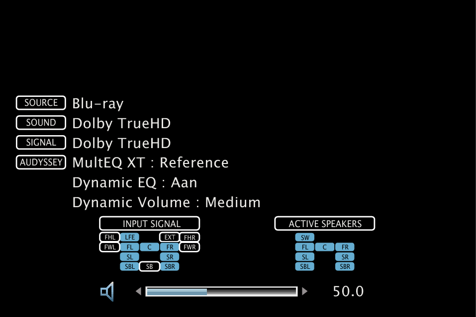 Druk op INFO op de afstandsbediening om de huidige bronnaam, het volume, de naam van de geluidsmodus en andere informatie weer te geven onderaan op het scherm.