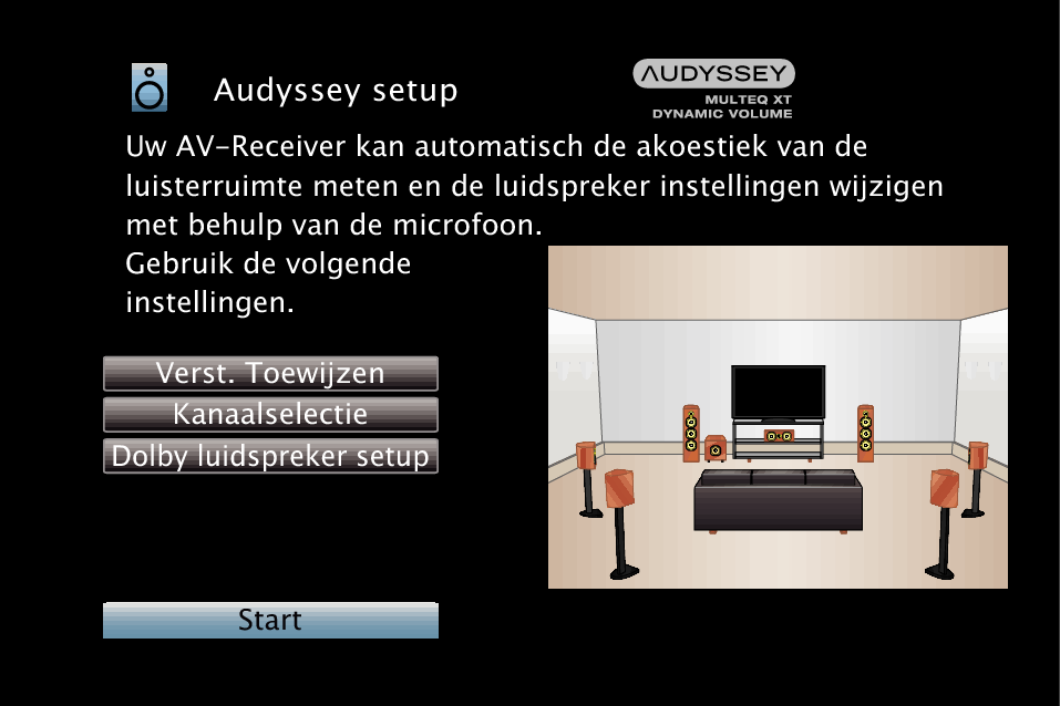 Wijzig de luidsprekeraansluiting of het subwoofervolume niet na de Audyssey® Setup. Als deze worden gewijzigd, voert u Audyssey® Setup opnieuw uit om de optimale equalizerinstellingen te configureren.