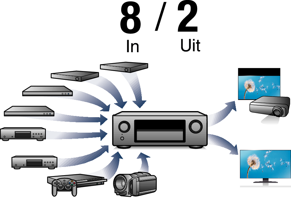 HDMI-aansluitingen voor het verbinden van diverse digitale AV-apparaten (8 ingangen, 2 uitgangen):