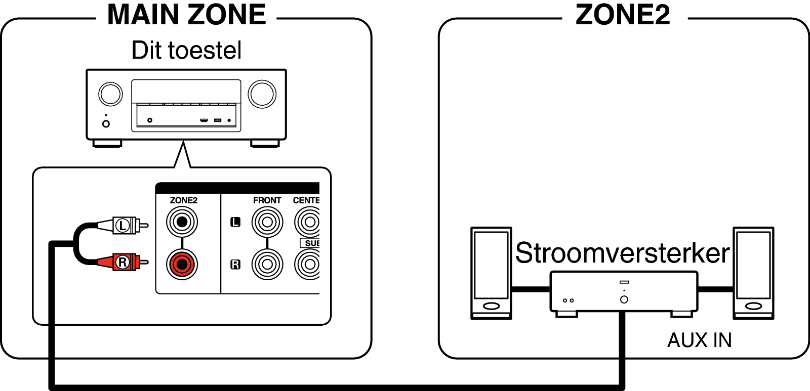 De audiosignalen van de ZONE2 audio-uitgangen van dit toestel worden uitgevoerd naar de ZONE2-versterkers en weergegeven op deze versterkers.