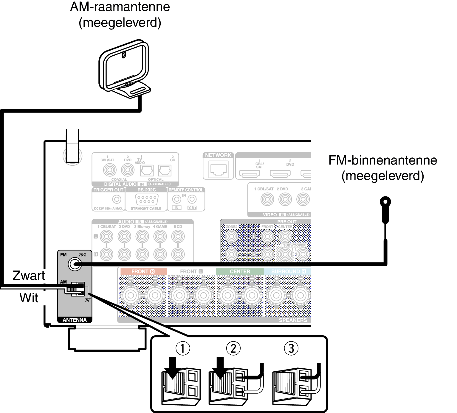 Sluit de antenne aan, stem af op een uitzending en verplaats dan de antenne naar de locatie waar er het minste ruis is. Gebruik dan tape, enz. om de antenne te bevestigen op deze locatie. (Luisteren naar FM/AM-uitzendingenkoppeling)