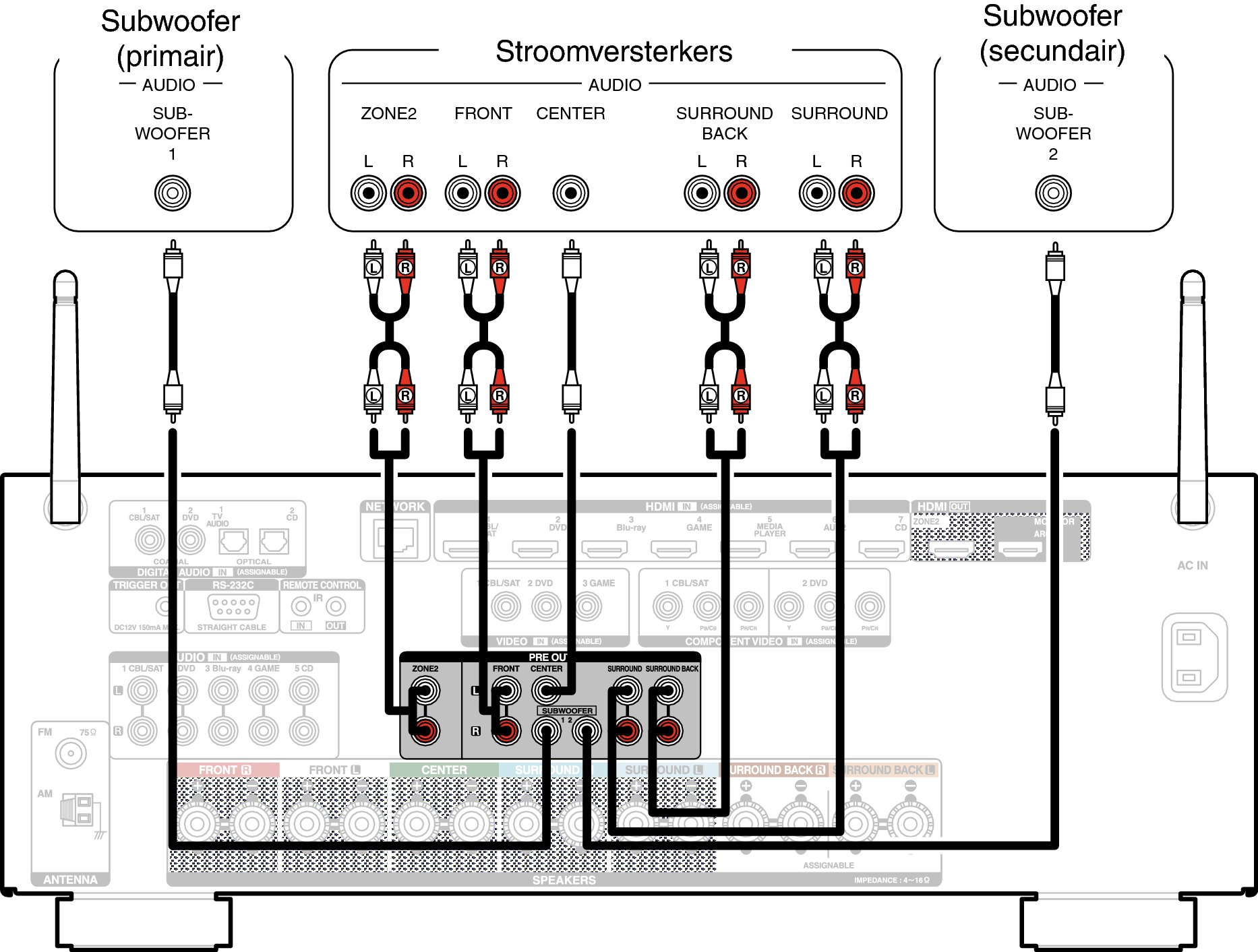 5.1-kanaals (MAIN ZONE) + 2-kanaals (ZONE2)