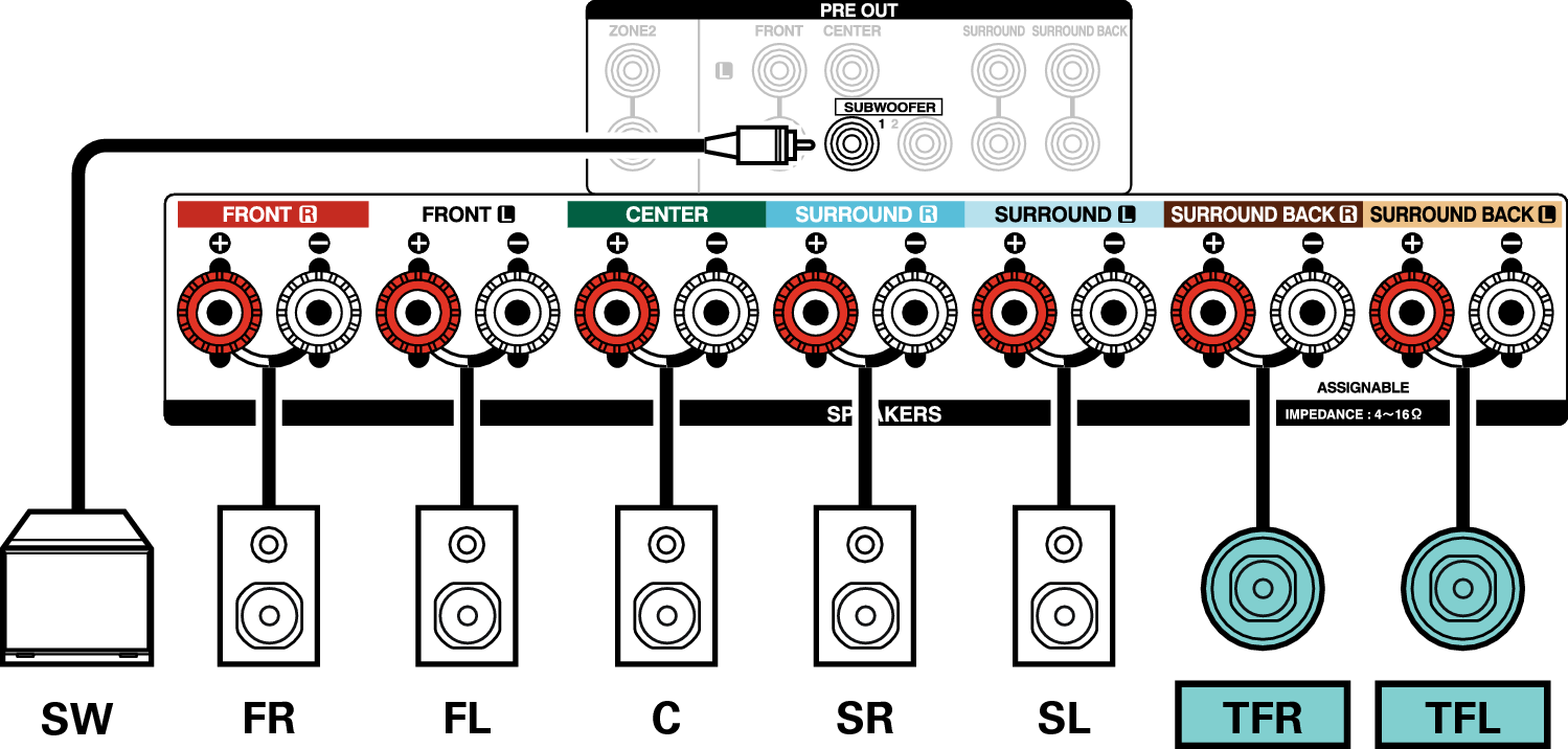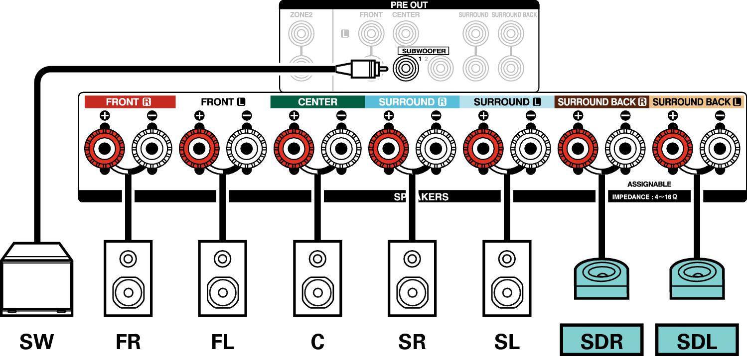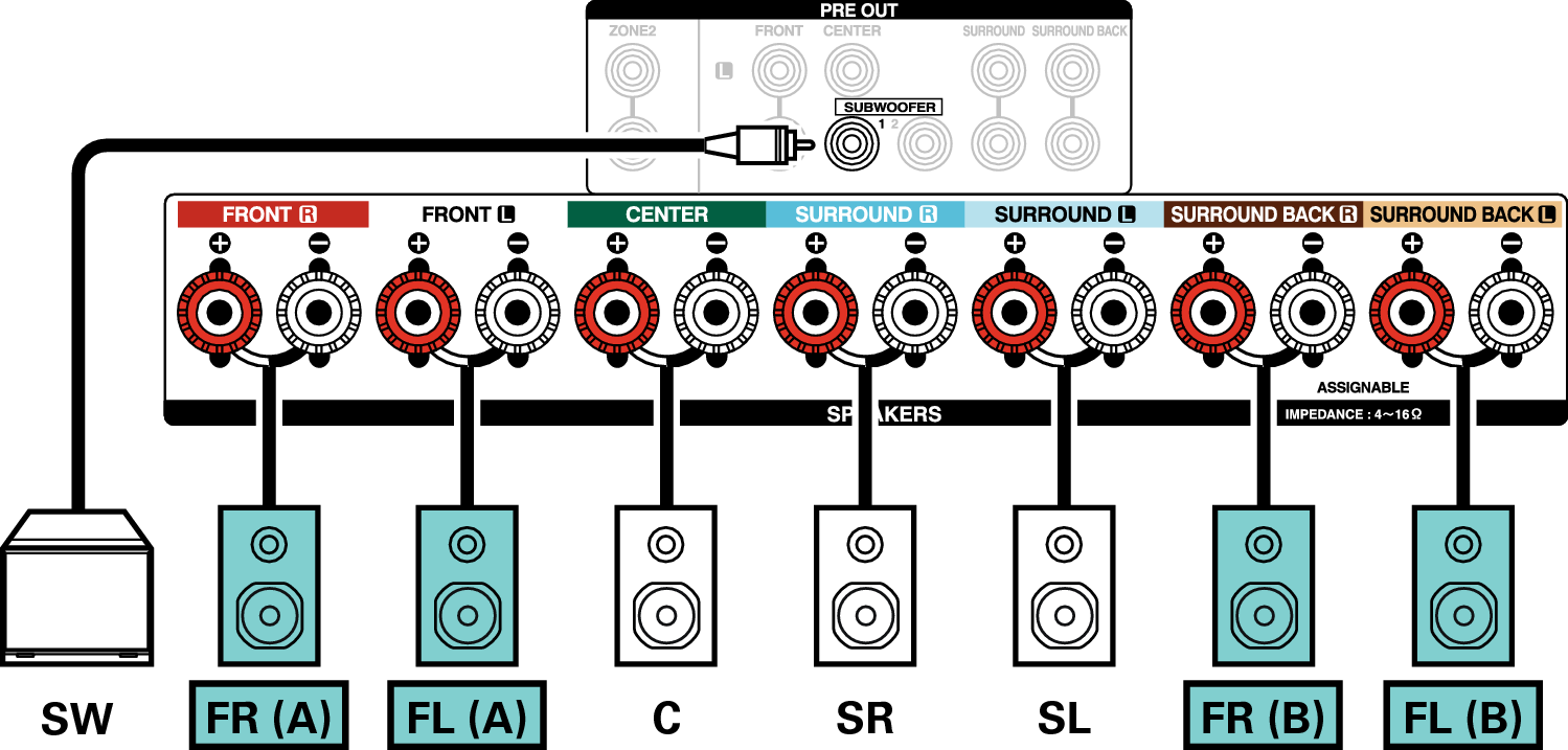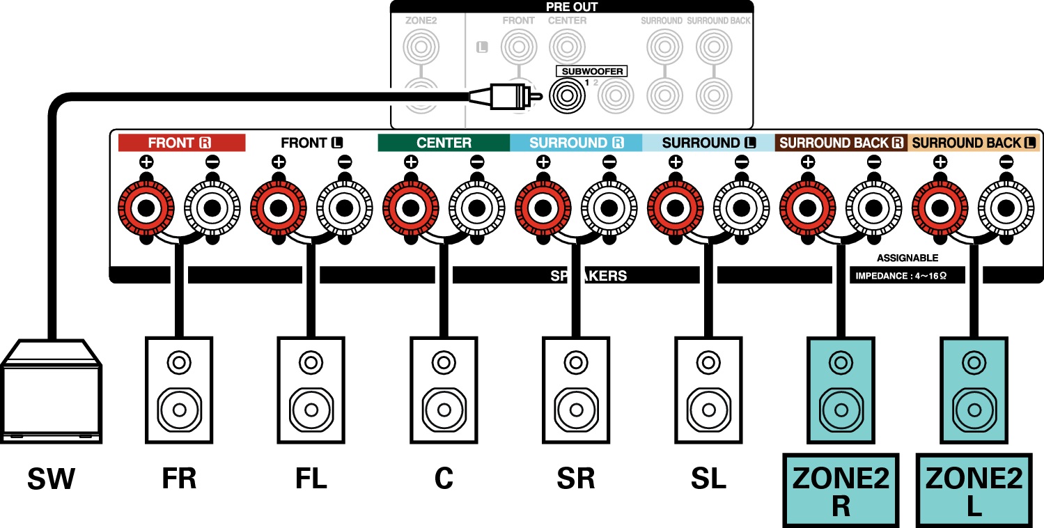 Deze aansluitmethode vormt een 5.1-kanaals luidsprekersysteem in de MAIN ZONE en een 2-kanaals systeem in ZONE2.