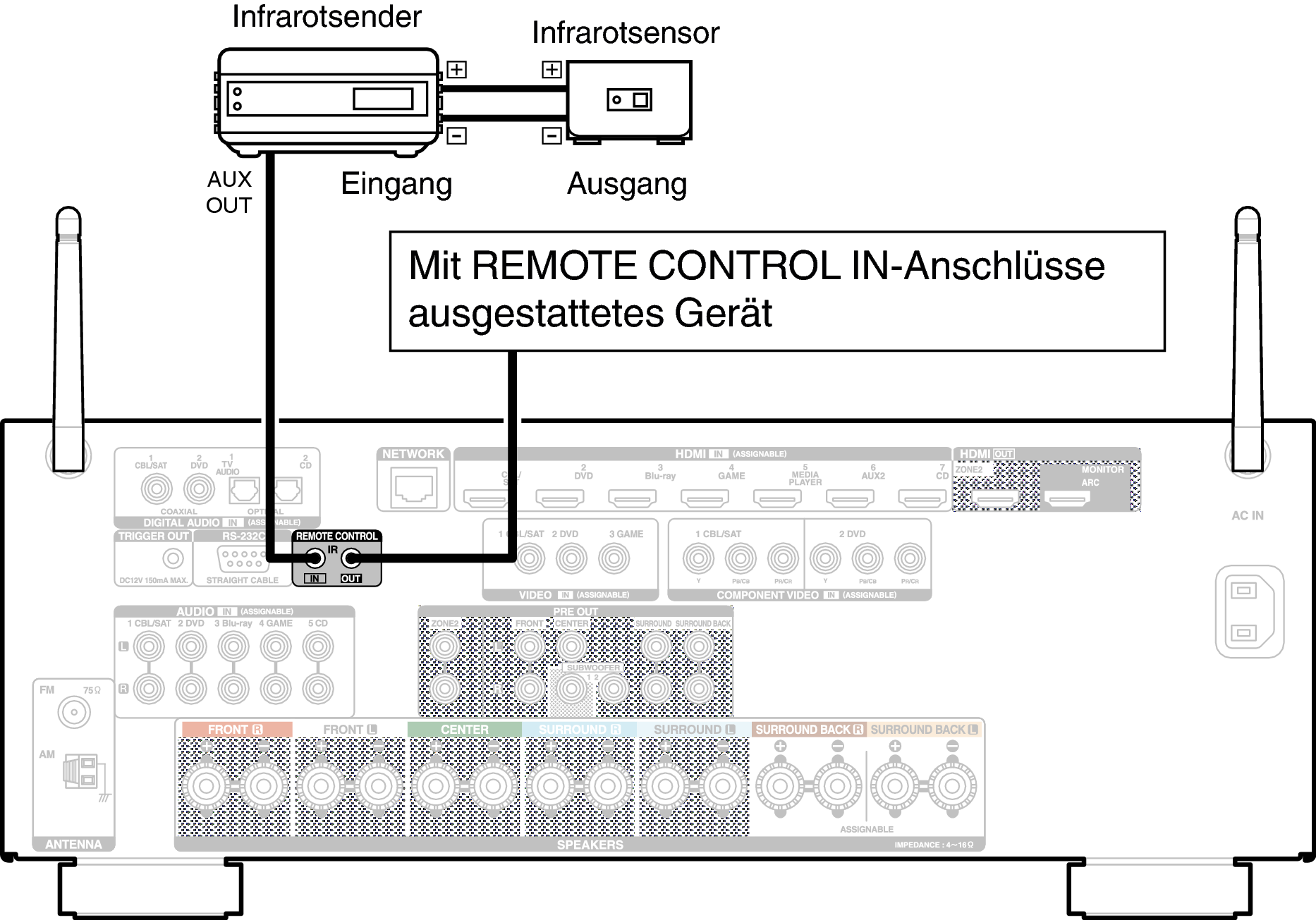 Wenn sich dieses Gerät an einem Platz befindet, der nicht mehr in Reichweite der Fernbedienung liegt (beispielsweise in einem Schrank), kann das Gerät dennoch mithilfe der Fernbedienung gesteuert werden, wenn Sie einen (separat erhältlichen) Fernbedienungsempfänger anschließen.