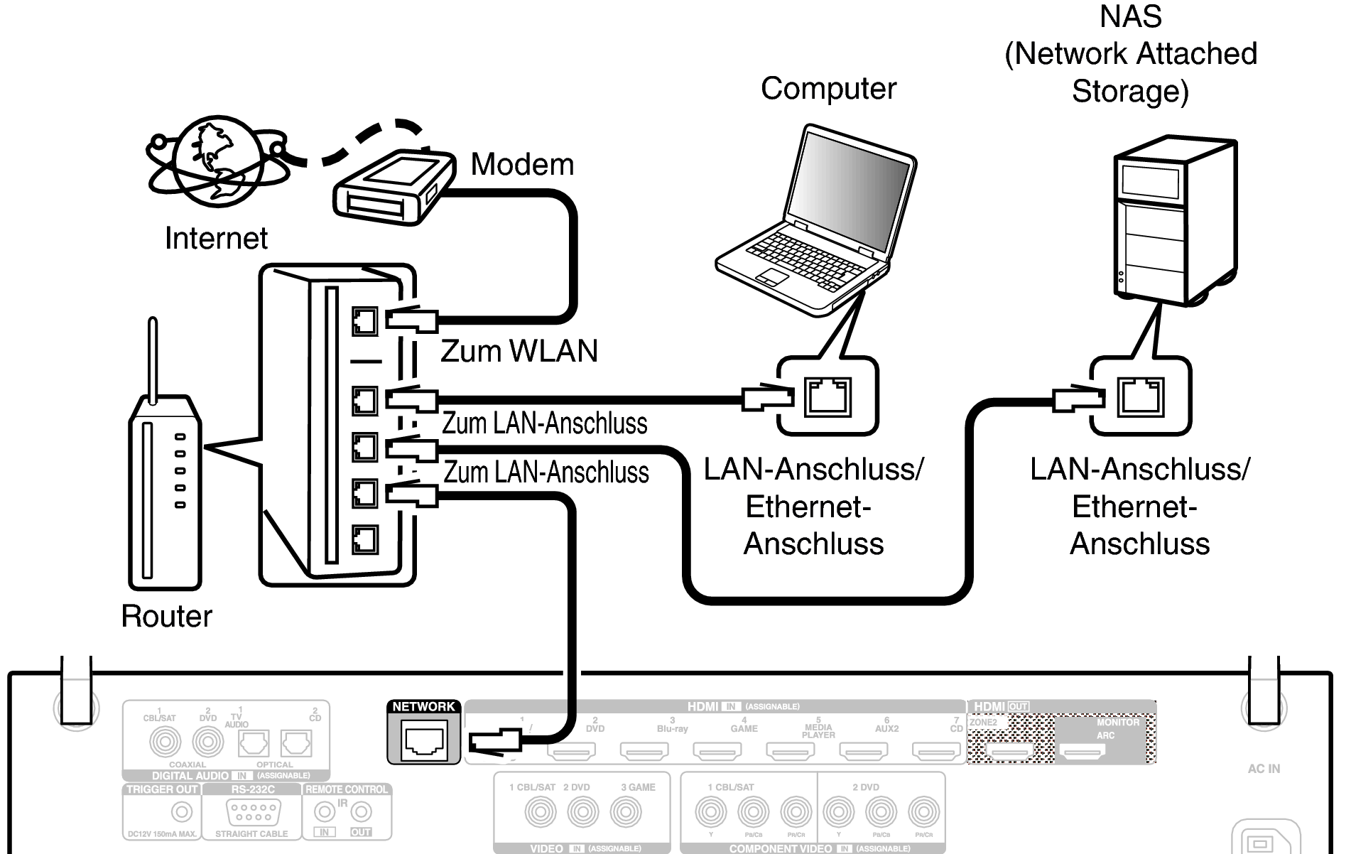 Für den Anschluss über ein kabelgebundenes LAN verbinden Sie den Router über ein LAN-Kabel mit diesem Gerät, wie in der nachstehenden Abbildung dargestellt.