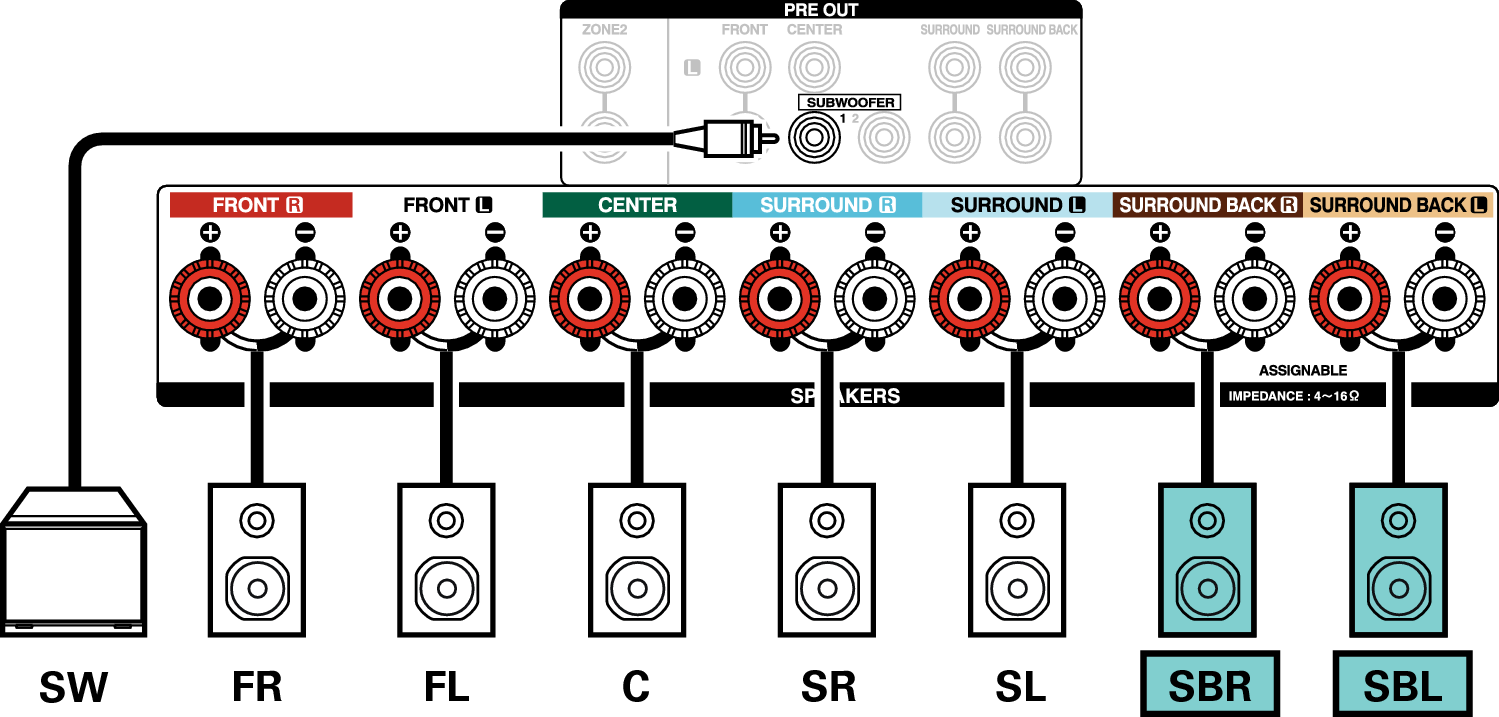 Wenn Sie nur einen Surround-Back-Lautsprecher verwenden, schließen Sie ihn am Anschluss SURROUND BACK L an.