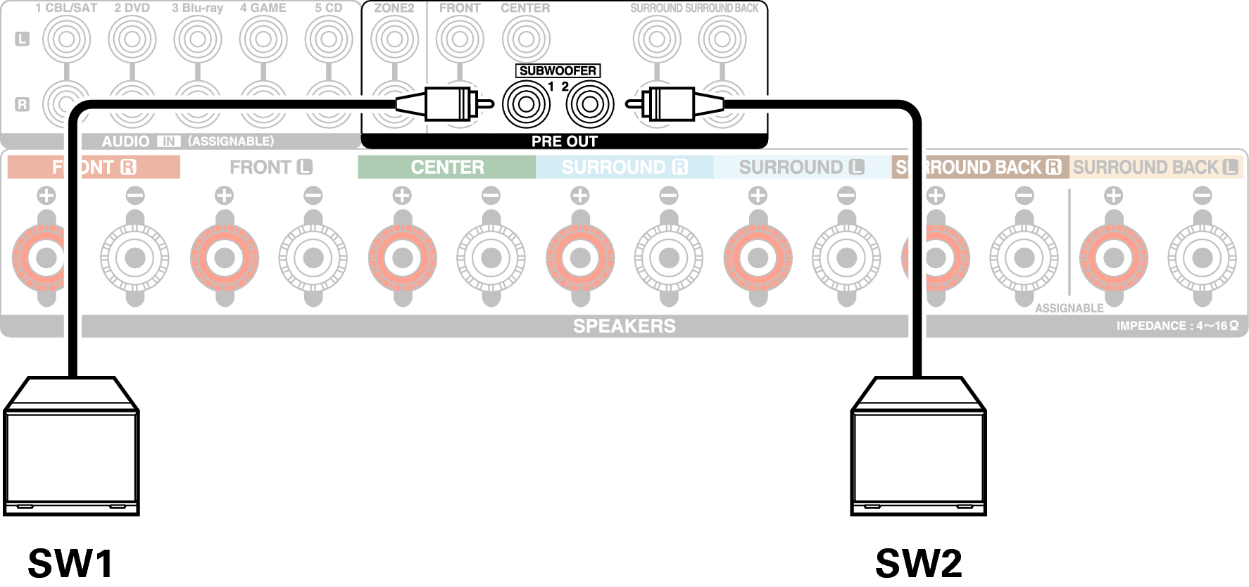 Über die jeweiligen Subwoofer-Anschlüsse wird dasselbe Signal ausgegeben.