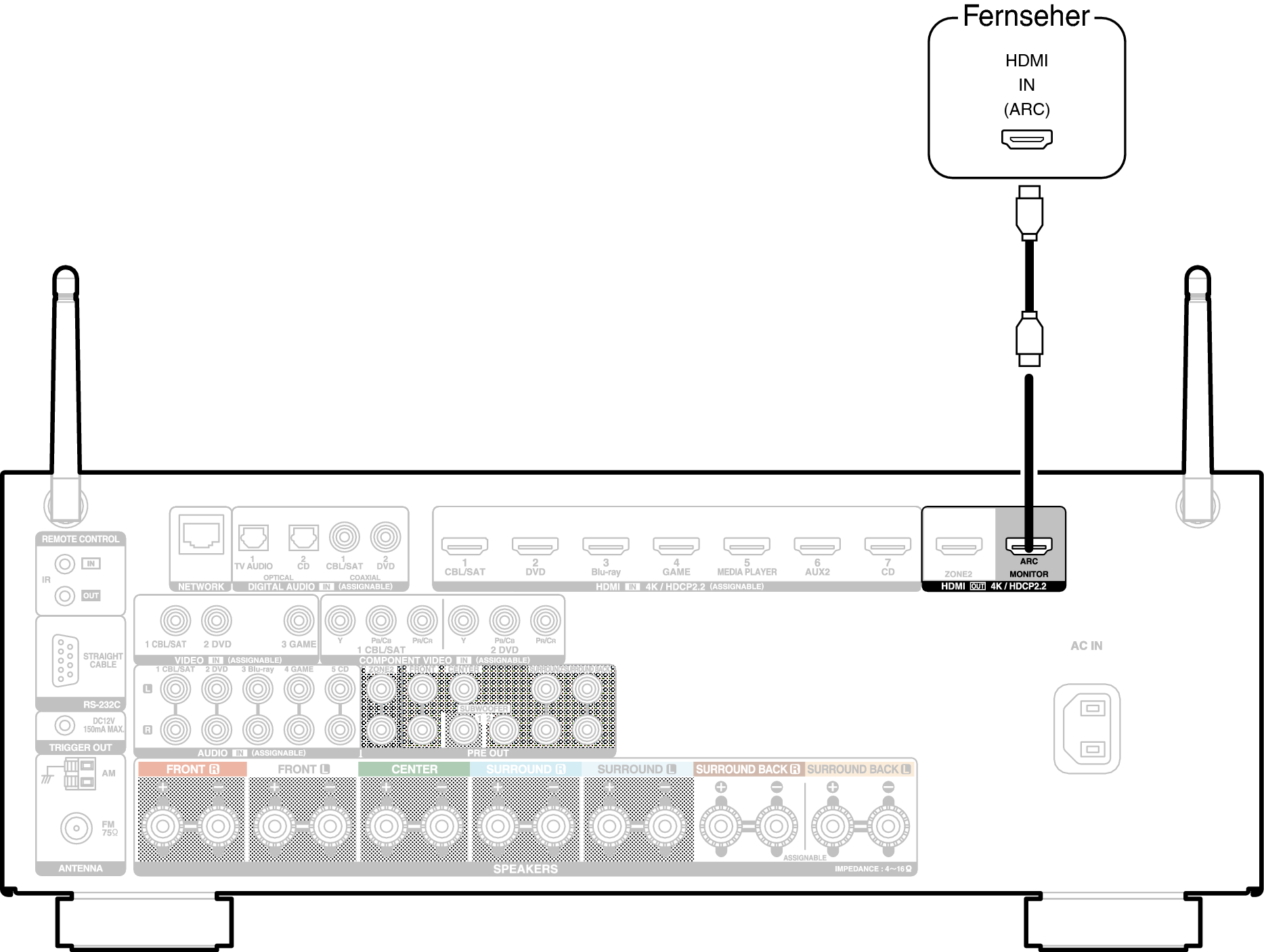 Wenn Sie die ARC-Funktion verwenden, nutzen Sie zum Anschließen den Anschluss HDMI MONITOR.