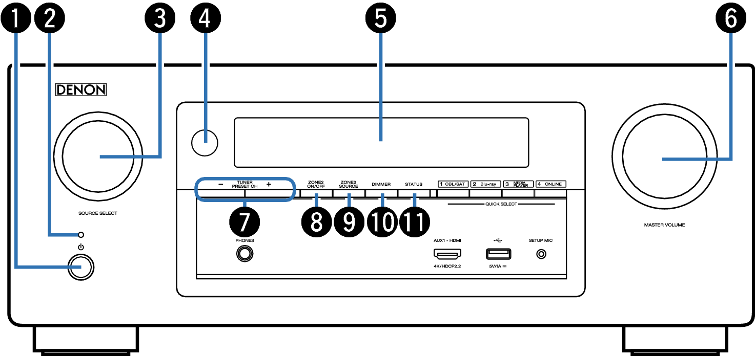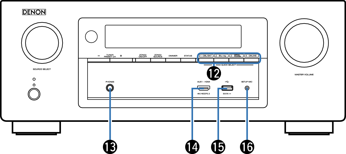 Si un casque est branché sur cette prise, le signal audio n’est plus transmis par les enceintes connectées ni par les bornes PRE OUT.