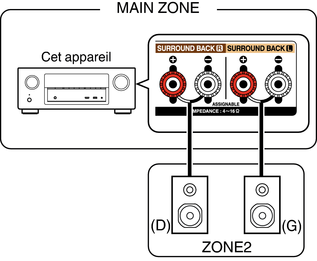 Les signaux audio des terminaux de sortie audio des ZONE2 de cet appareil sont émis vers les amplificateurs des ZONE2 et sont lus sur ces mêmes amplificateurs.