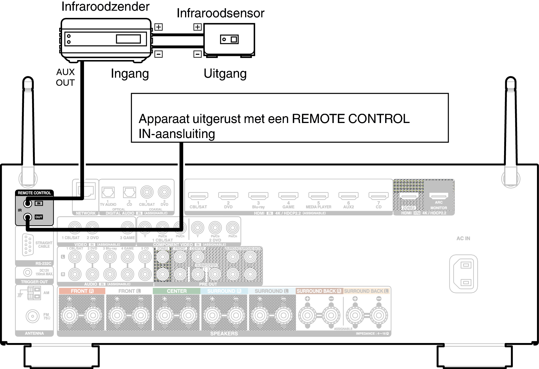 Wanneer dit toestel wordt geïnstalleerd op een locatie waar de afstandsbedieningssignalen geen bereik hebben (installatie in een kast enz.), kan het nog steeds via de afstandsbediening worden gebruikt door een ontvangereenheid van de afstandsbediening aan te sluiten (afzonderlijk verkrijgbaar).