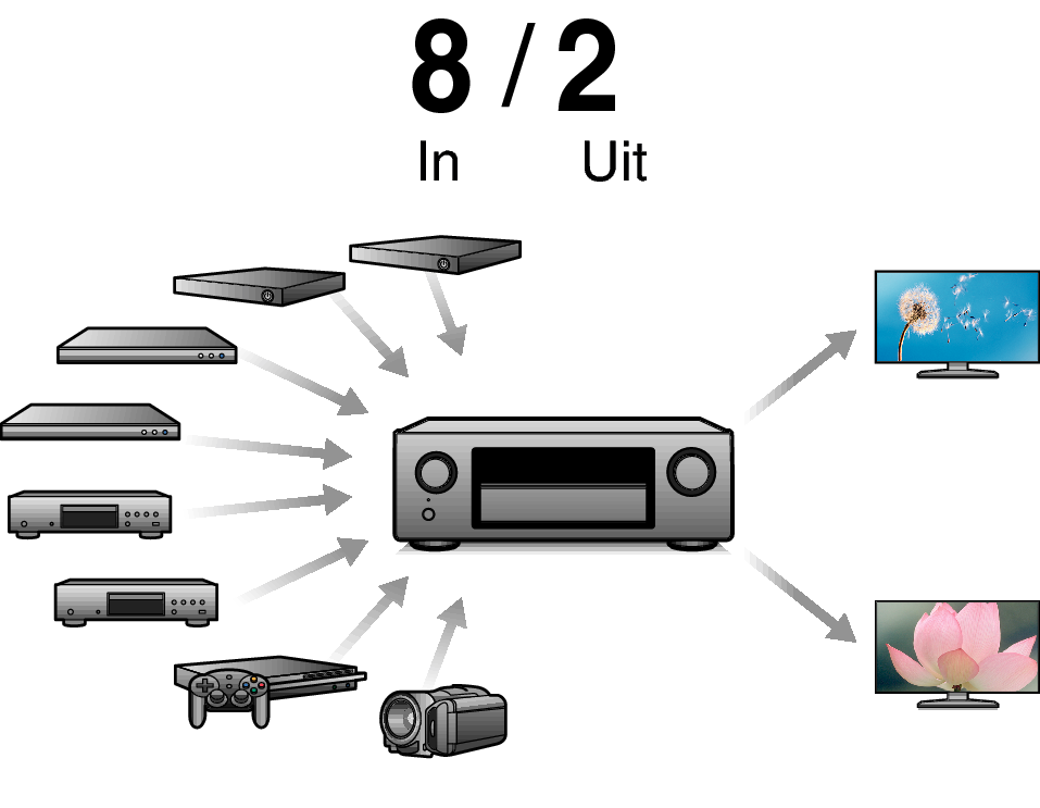 HDMI-aansluitingen voor het verbinden van diverse digitale AV-apparaten (8 ingangen, 2 uitgangen):