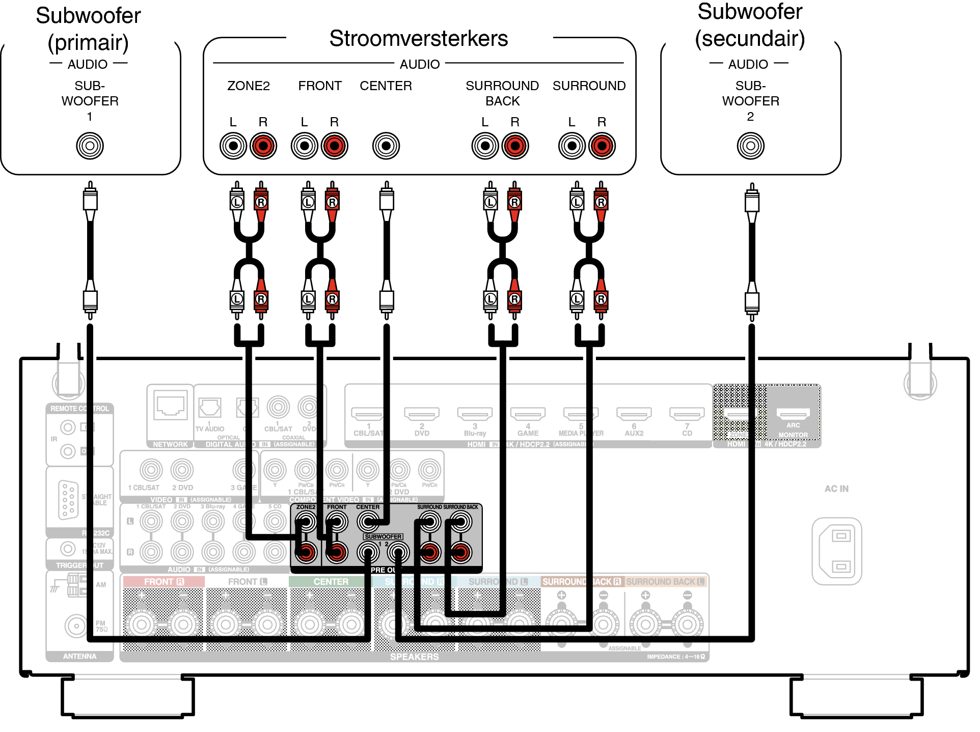 Voorbeeldaansluitingen wanneer u luidsprekers surround achter gebruikt