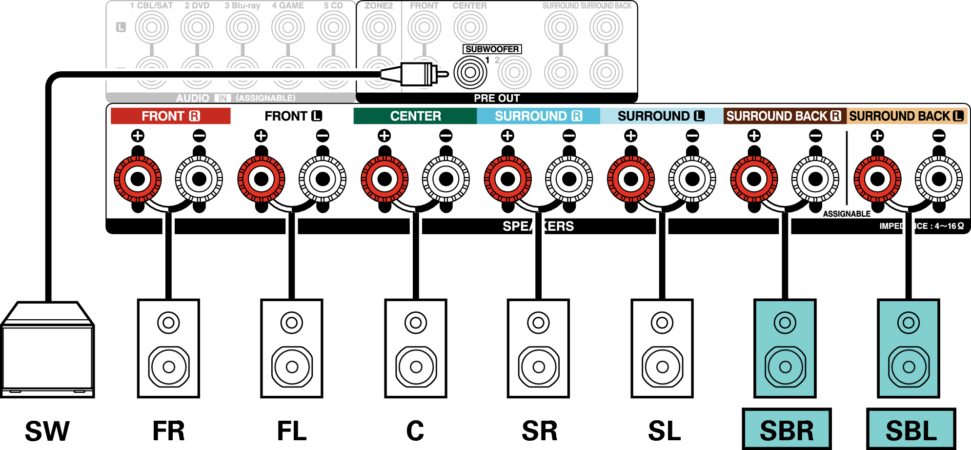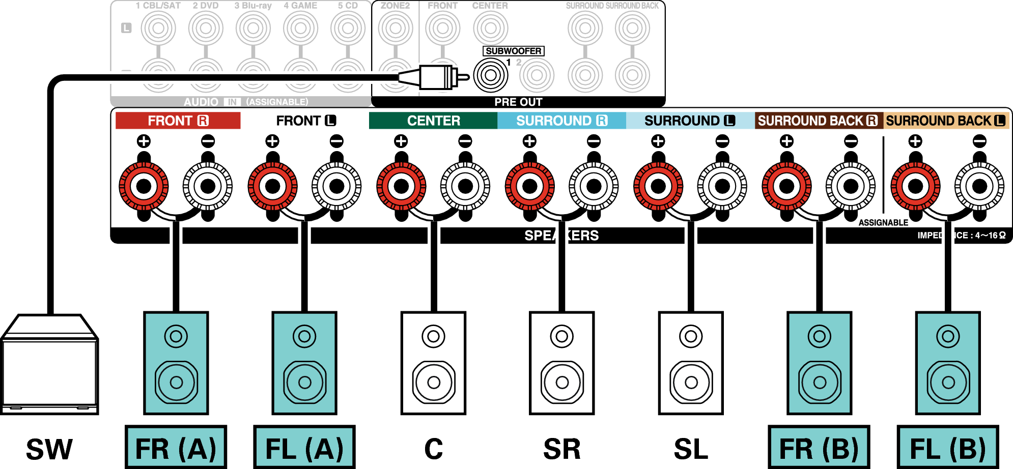 Deze aansluitmethode vormt een 5.1-kanaals luidsprekersysteem in de MAIN ZONE en een 2-kanaals systeem in ZONE2.