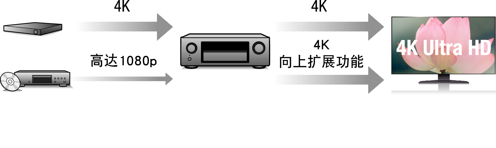 本机配有允许模拟视频或SD (Standard Definition)视频以4K(3840×2160像素)通过HDMI进行输出的4K视频升级功能。此功能使设备可通过单根HDMI电缆连接到电视,并可产生任何视频源的高清晰度图像。