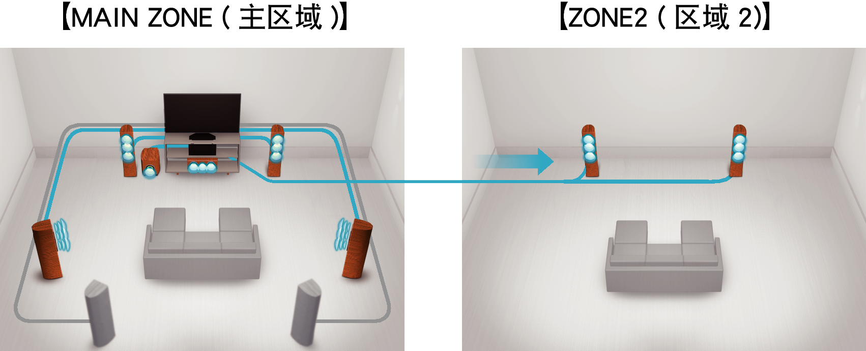 ZONE2 (区域2) 多室输出包括HDMI输出,通过该输出,您可在该房间内欣赏不同A/V音源,同时在主房间播放其他节目。