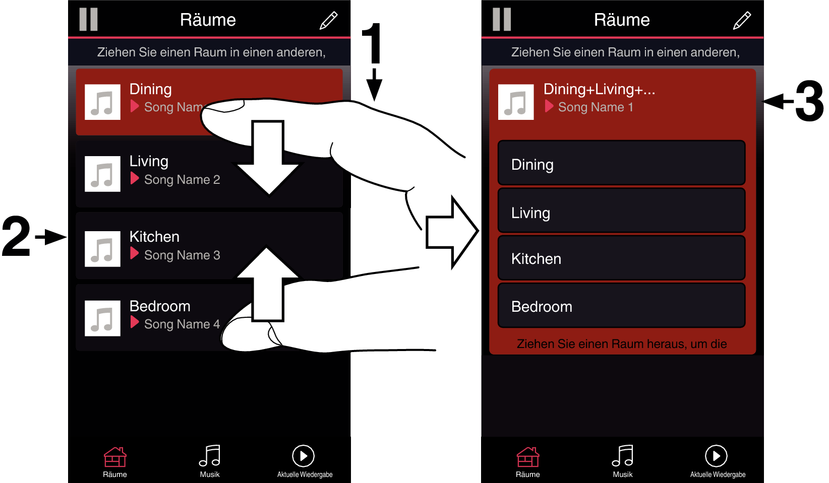 Mit einer “Spreizbewegung” können Sie bequem alle Räume aus der Gruppe entfernen und den Party-Modus verlassen.