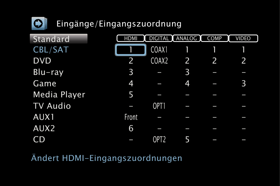 Ändern Sie die Zuordnung des HDMI-Eingangsanschlusses, des digitalen Audioeingangsanschlusses, des analogen Audioeingangsanschlusses, des Component Video-Eingangsanschlusses und des Videoeingangsanschlusses, wenn Sie eine andere Eingangsquelle anschließen als die aufgedruckten Audio-/Videoeingangsanschlüsse dieses Geräts.