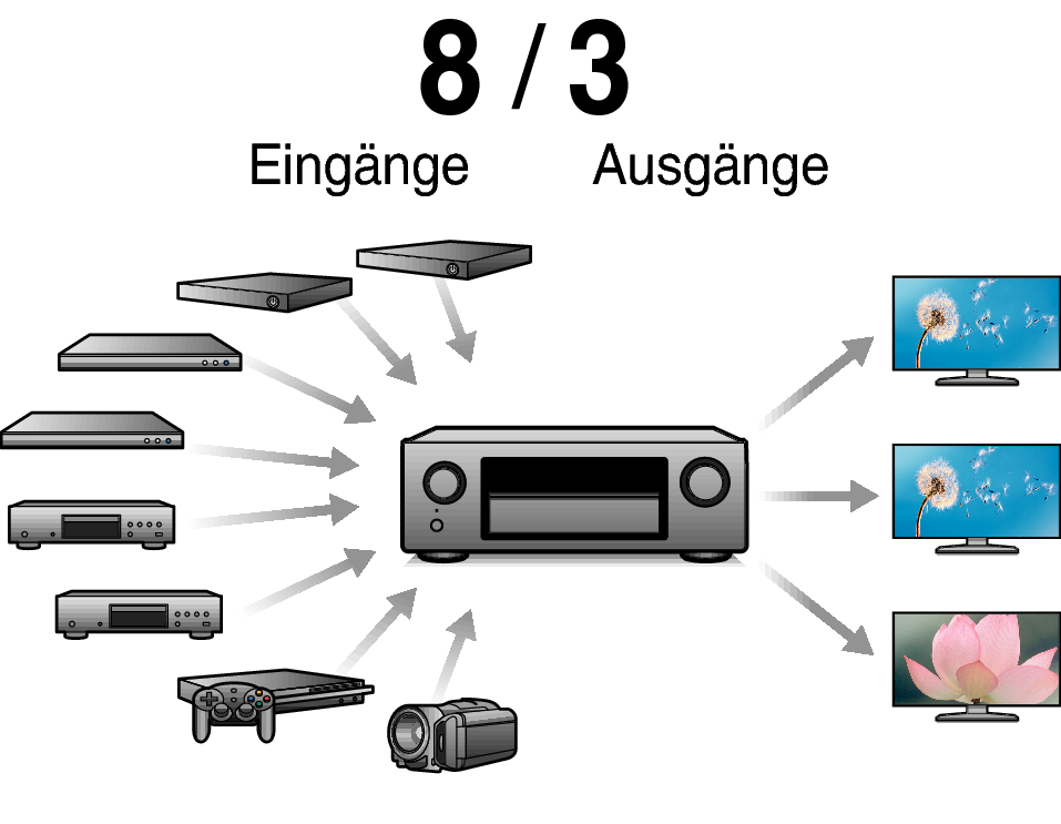 HDMI-Anschlüsse ermöglichen Anschlüsse an zahlreiche AV-Geräte (8 Eingänge, 3 Ausgänge)