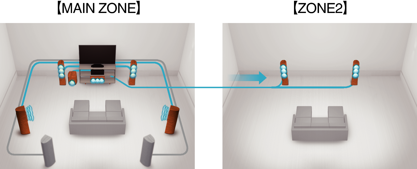 Die ZONE2-Ausgabe für mehrere Räume beinhaltet eine HDMI-Ausgabe, bei der Sie in einem Raum eine ganz andere A/V-Quelle wiedergeben können als das im Hauptraum wiedergegebene Programm.