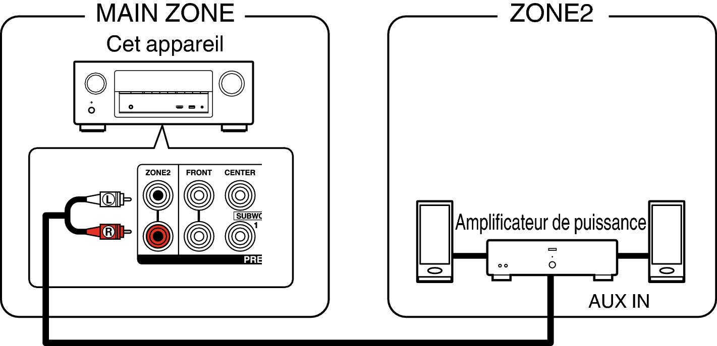 Les signaux audio des terminaux de sortie audio des ZONE2 de cet appareil sont émis vers les amplificateurs des ZONE2 et sont lus sur ces mêmes amplificateurs.
