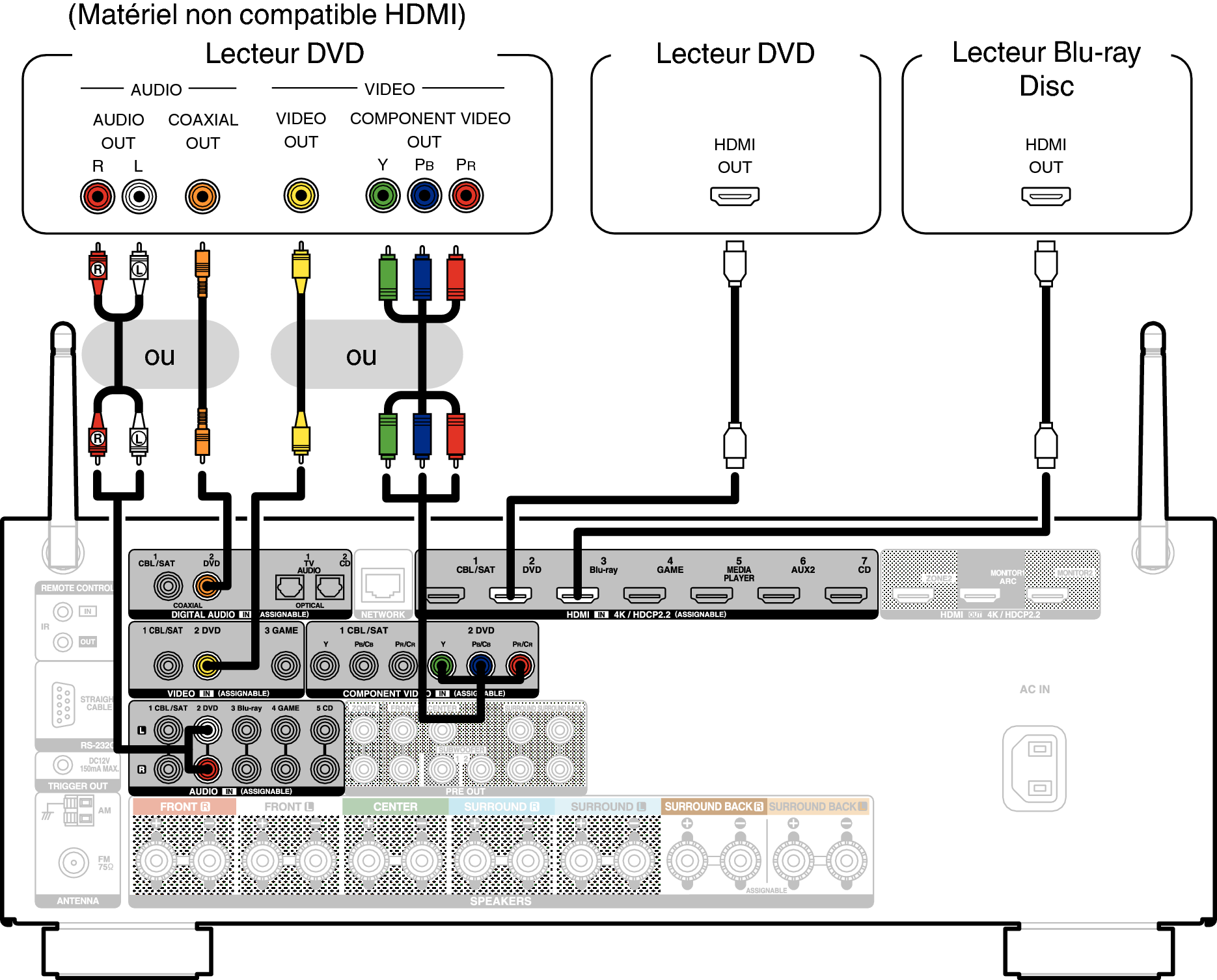 Cette explication utilise la connexion avec un lecteur DVD ou un lecteur Blu-ray Disc comme exemple.