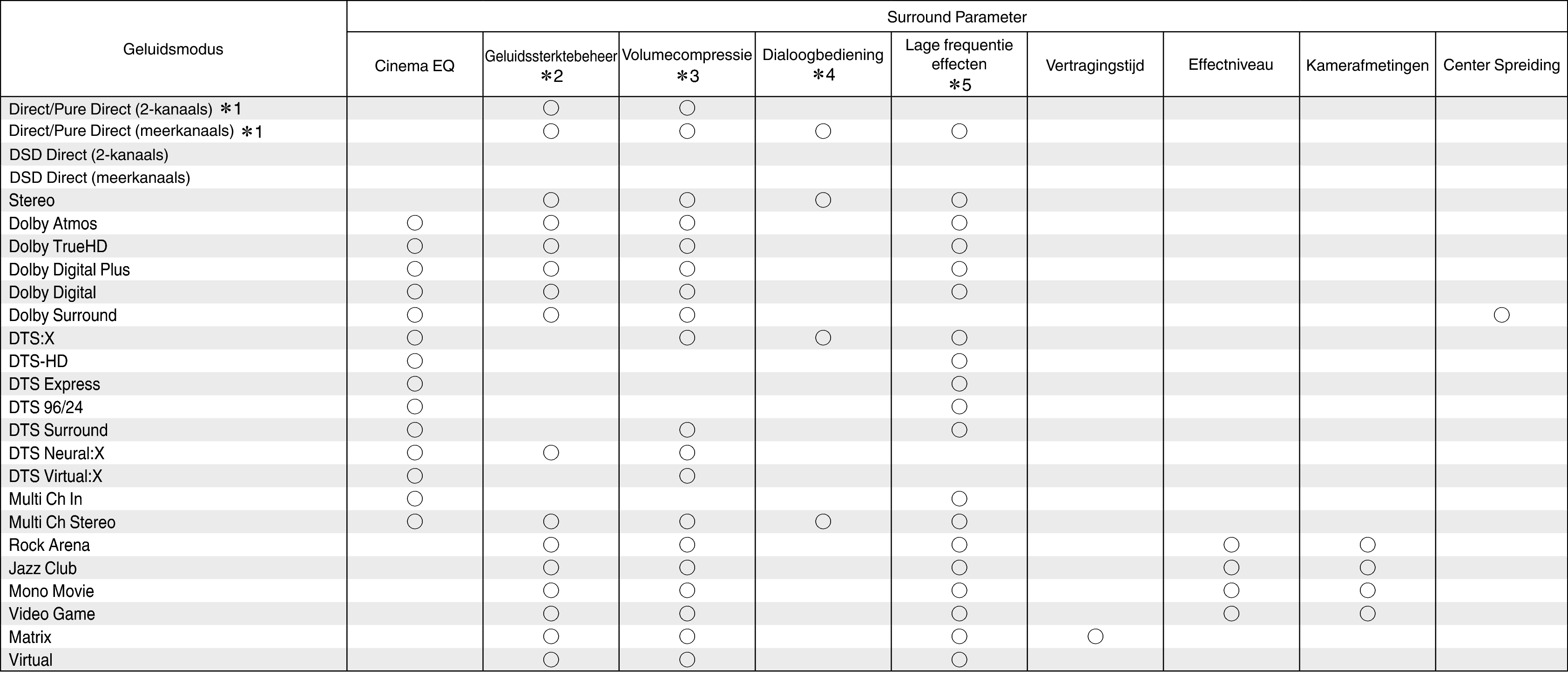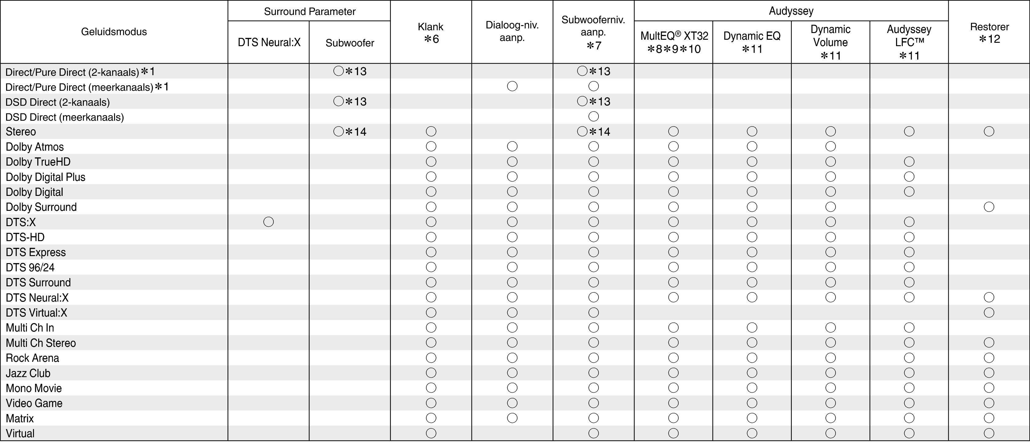 ∗1, ∗6 - ∗14: Geluidsmodi en surround-parameterskoppeling