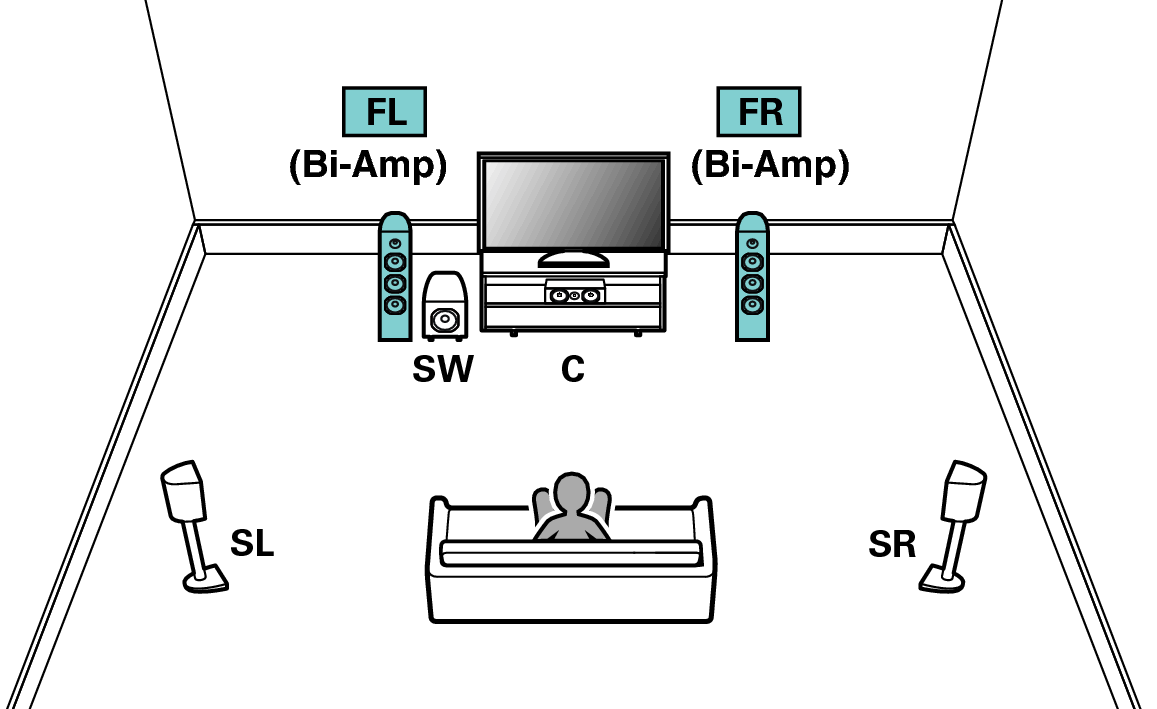 Mit diesem System können Sie 5.1-Kanäle wiedergeben. Sie können den Bi-Amp-Anschluss für die Front-Lautsprecher verwenden. Bei der Bi-Amp-Anschlussmethode können Sie separate Verstärker an die Hochtöner- und Tieftöneranschlüsse eines Bi-Amp-fähigen Lautsprechers anschließen. Über diesen Anschluss kann die Gegen-EMK (Kraft, die nicht ausgegeben, sondern zurückgegeben wird) vom Tieftöner direkt zum Hochtöner fließen, ohne die Klangqualität zu beeinträchtigen. Dies führt zu einer verbesserten Klangqualität.