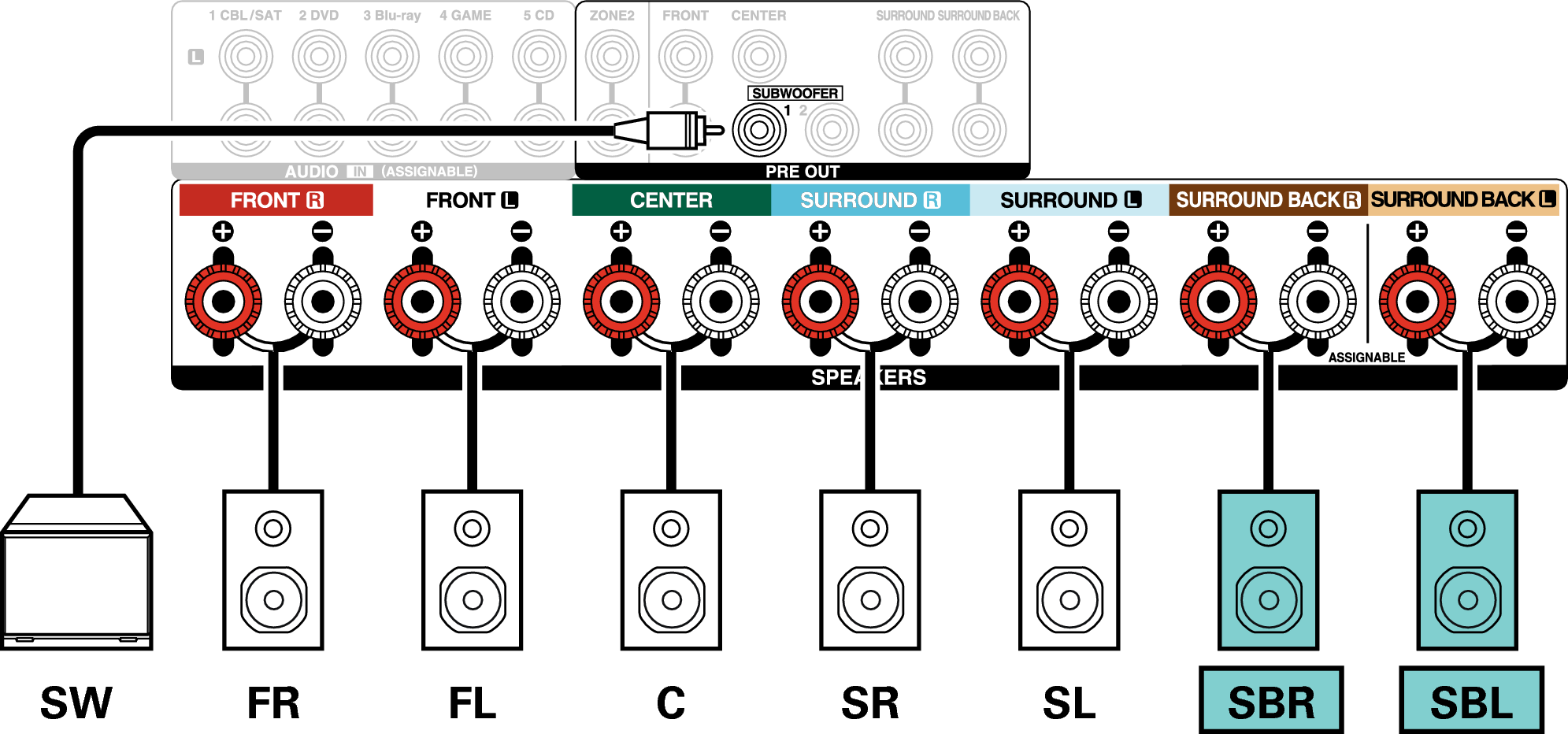 Wenn Sie nur einen Surround-Back-Lautsprecher verwenden, schließen Sie ihn am Anschluss SURROUND BACK L an.