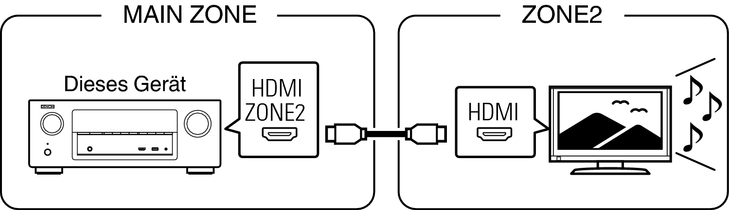 Wenn ein Fernseher an den HDMI ZONE2 OUT-Anschluss angeschlossen wurde können Sie Video oder Audio von dem an den HDMI 1 – 7 IN-Anschluss angeschlossenen Gerät in ZONE2 wiedergeben (HDMI ZONE2-Funktion).