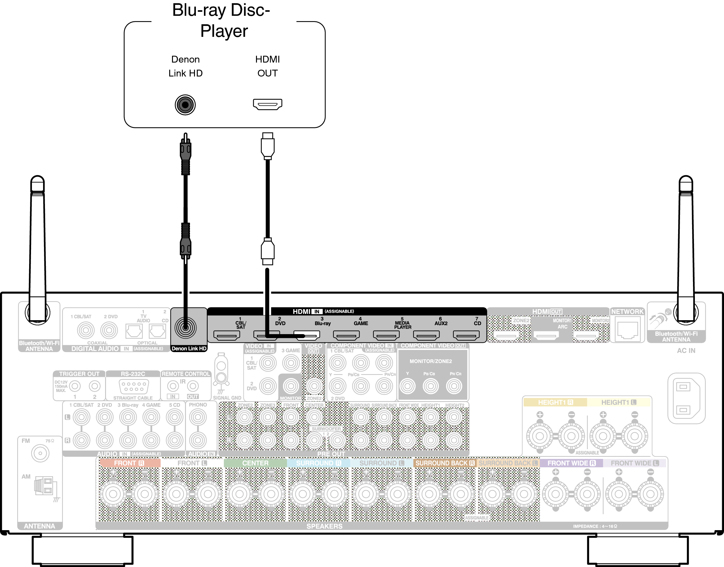Wenn Sie einen Player, der mit der Denon Link HD-Funktion kompatibel ist, über den Denon Link HD-Anschluss anschließen, ist die Wiedergabequalität im Vergleich zu einem reinen HDMI-Anschluss besser.