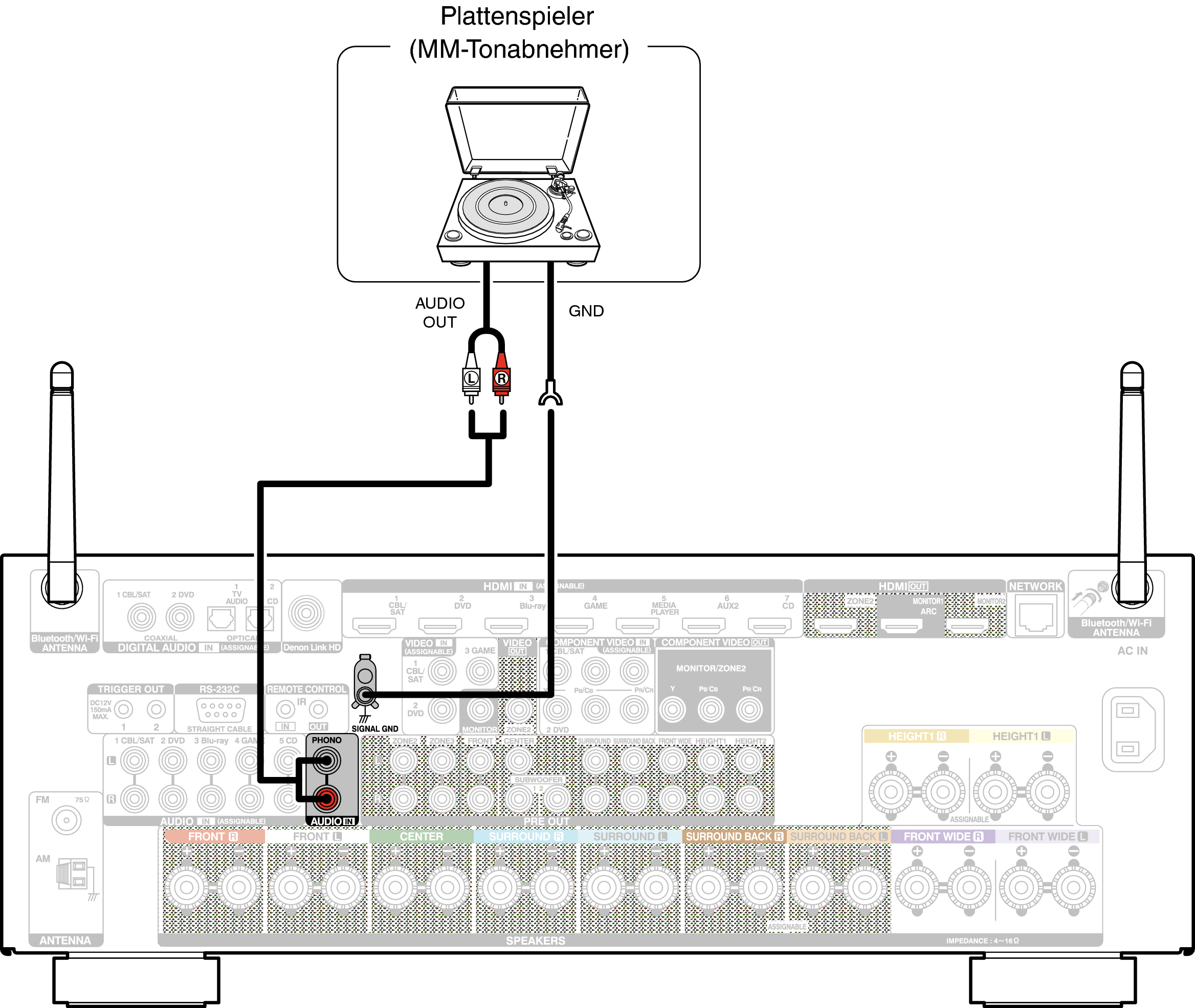 Die Erdungsleitung (SIGNAL GND) dieses Geräts dient nicht als Sicherheitserdung. Wenn dieser Anschluss vorgenommen wird und viele Störungen vorhanden sind, können diese dadurch verringert werden. Beachten Sie, dass die Erdungsleitung, abhängig vom Plattenspieler, auch den umgekehrten Effekt der Geräuscherhöhung haben kann. In diesem Fall ist es nicht nötig, das Erdungskabel anzuschließen.