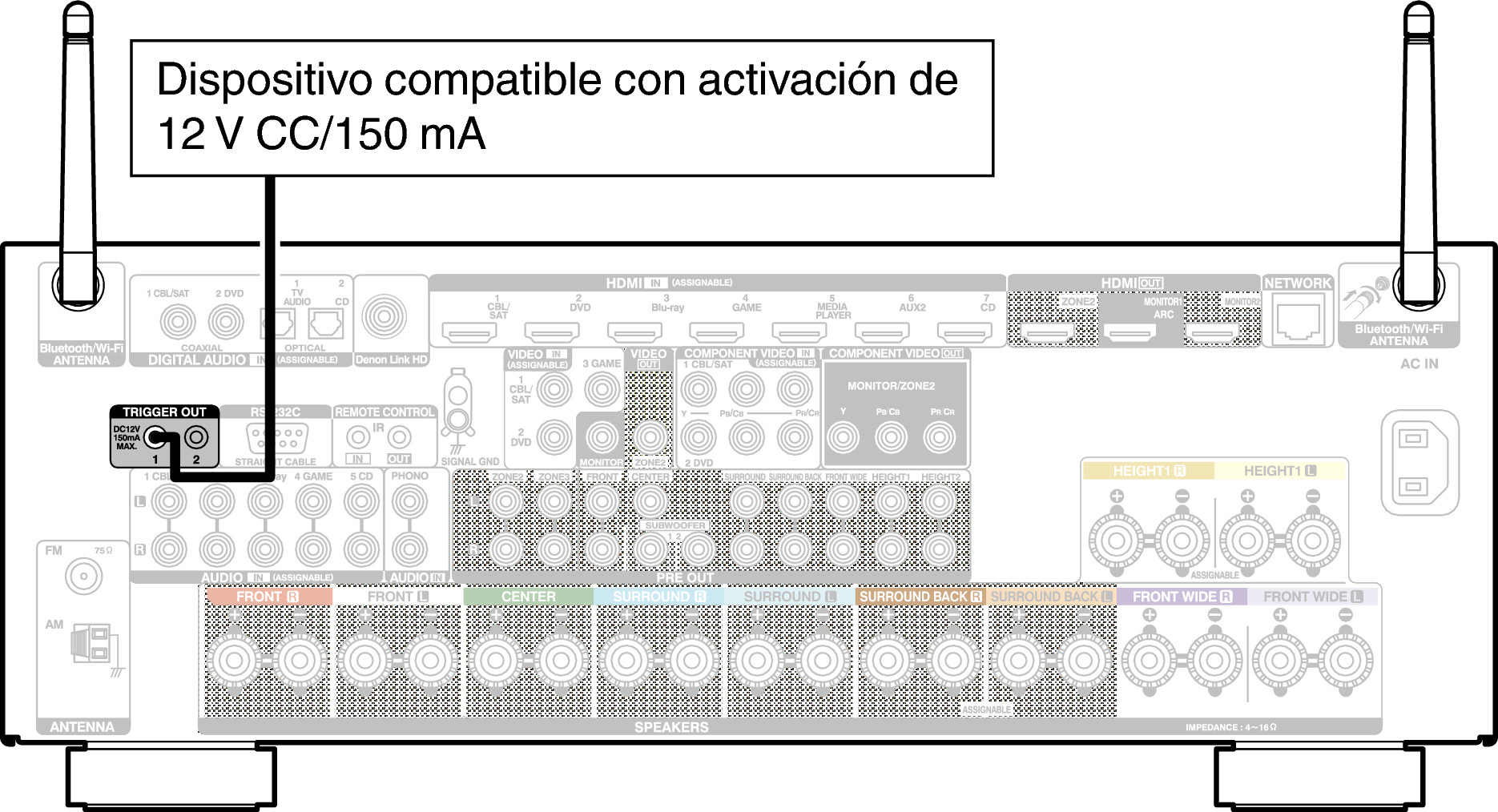 Si el nivel de entrada de activación admisible del dispositivo conectado es superior a 12 V CC/150 mA, o se ha cortocircuitado, no será posible utilizar el conector TRIGGER OUT. En ese caso, apague la unidad y desconéctela.
