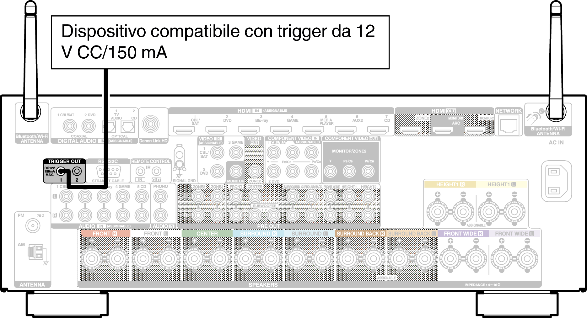 La presa TRIGGER OUT emette un segnale elettrico di massimo 12 V CC/150 mA.