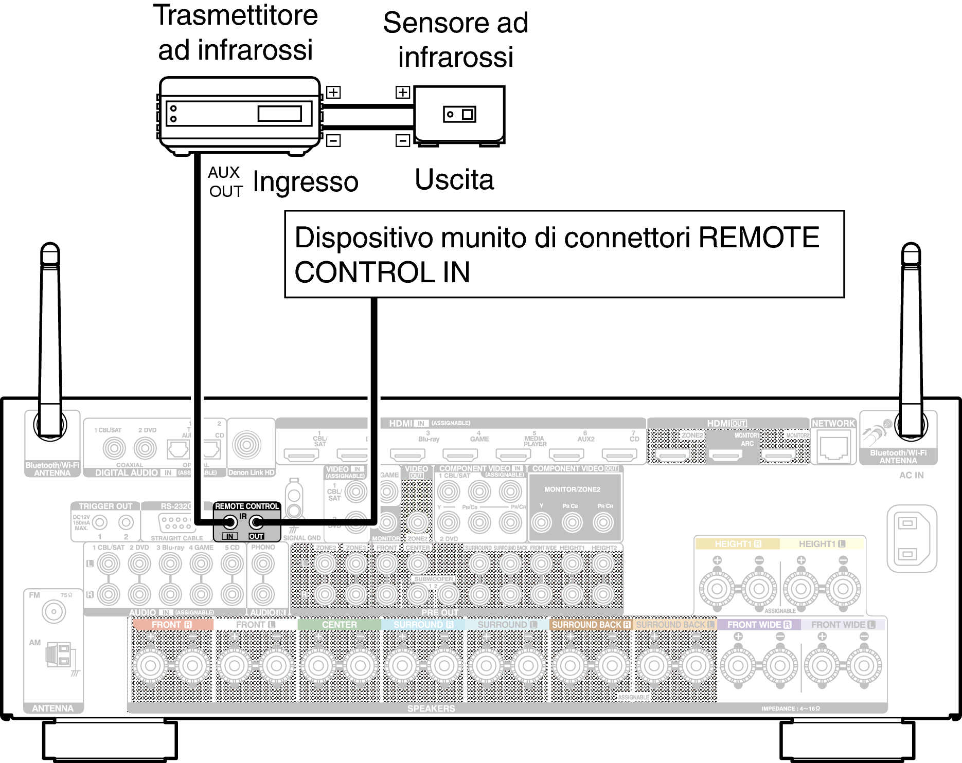 Quando l’unità viene installata in una posizione in cui non possono arrivare i segnali del telecomando (installazione all’interno di un armadietto ecc.), può ancora essere azionata dal telecomando collegando un ricevitore del telecomando (venduto separatamente).
