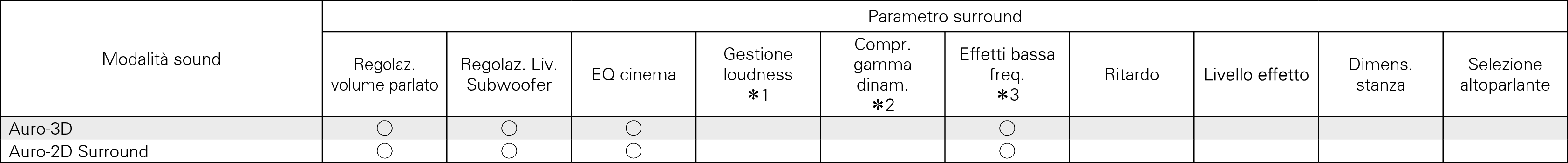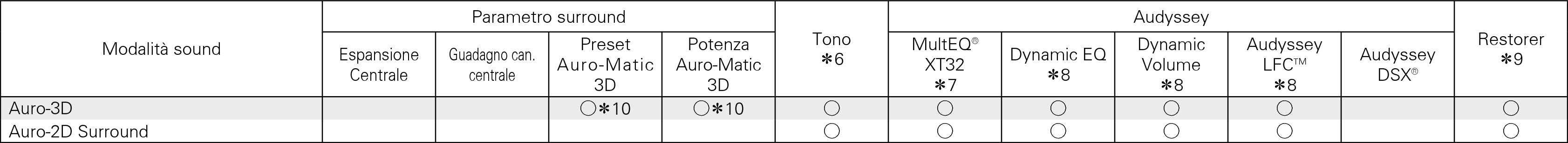Questa modalità può essere impostata se il segnale di ingresso non contiene un segnale Auro-3D o se il segnale di ingresso Auro-3D non contiene canali anteriori di altezza.