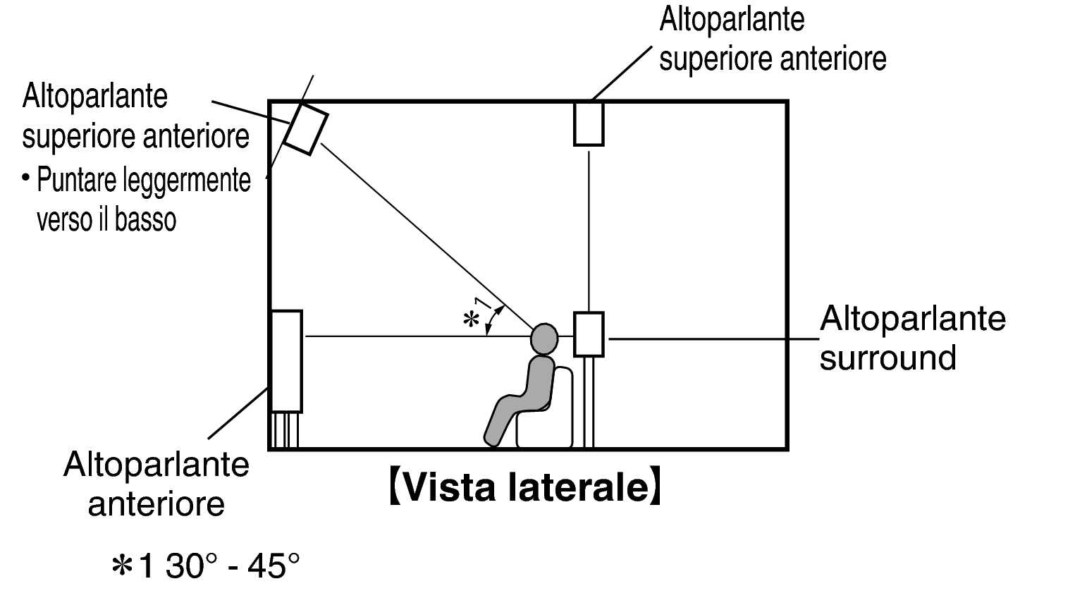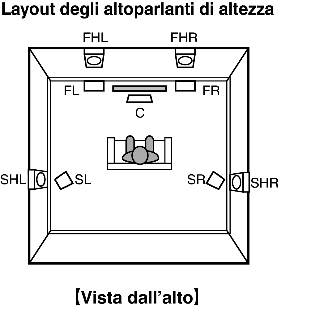 Montare gli altoparlanti TOP MIDDLE (CENTRALI SUPERIORI) sinistro e destro direttamente sopra la posizione di ascolto principale e allineati con gli altoparlanti anteriori sinistro e destro. |