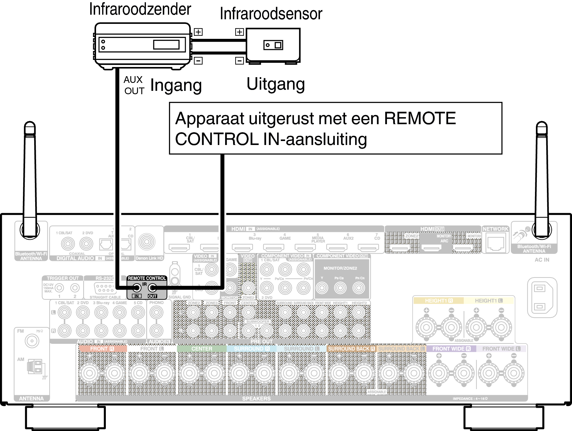 Wanneer dit toestel wordt geïnstalleerd op een locatie waar de afstandsbedieningssignalen geen bereik hebben (installatie in een kast enz.), kan het nog steeds via de afstandsbediening worden gebruikt door een ontvangereenheid van de afstandsbediening aan te sluiten (afzonderlijk verkrijgbaar).