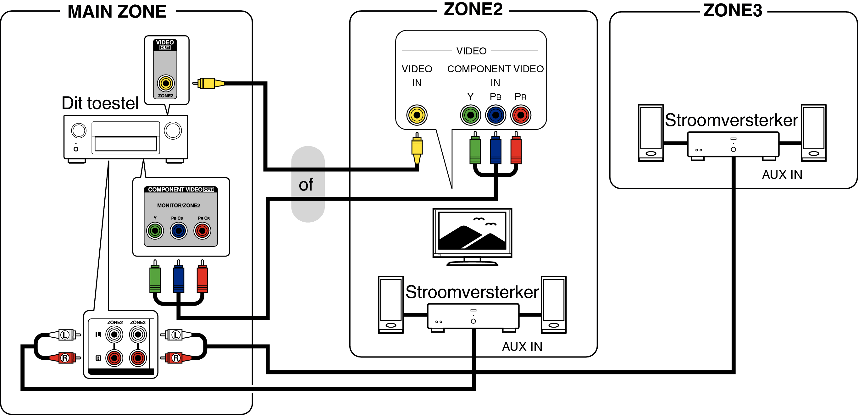 De audiosignalen van de ZONE2- en ZONE3-audio-uitgangen van dit toestel worden uitgevoerd naar de ZONE2- en ZONE3-versterkers en afgespeeld via deze versterkers.