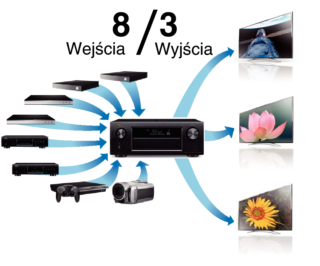 W celu podłączenia do szerokiego zakresu źródeł sygnału cyfrowego, to urządzenie posiada 8 wejść HDMI, w tym 1 na panelu przednim, które pozwala szybko i wygodnie podłączyć kamerę, konsolę do gier lub inne urządzenia wyposażone w HDMI. Są podwójne wyjścia HDMI dla pomieszczenia głównego oraz trzecie wyjście HDMI dla innego pomieszczenia.
