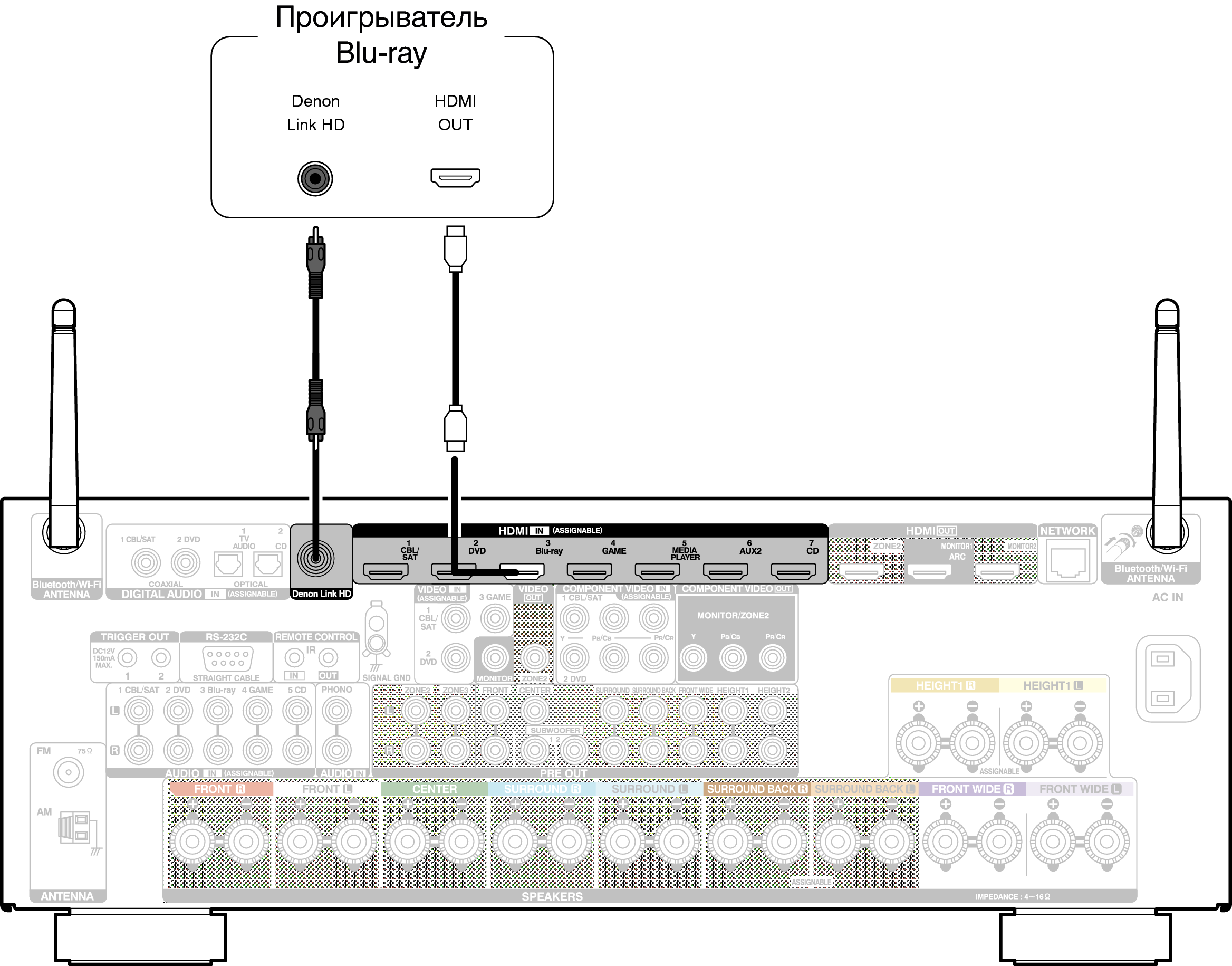 Для данного метода подключения необходимы соединения HDMI и Denon Link HD.