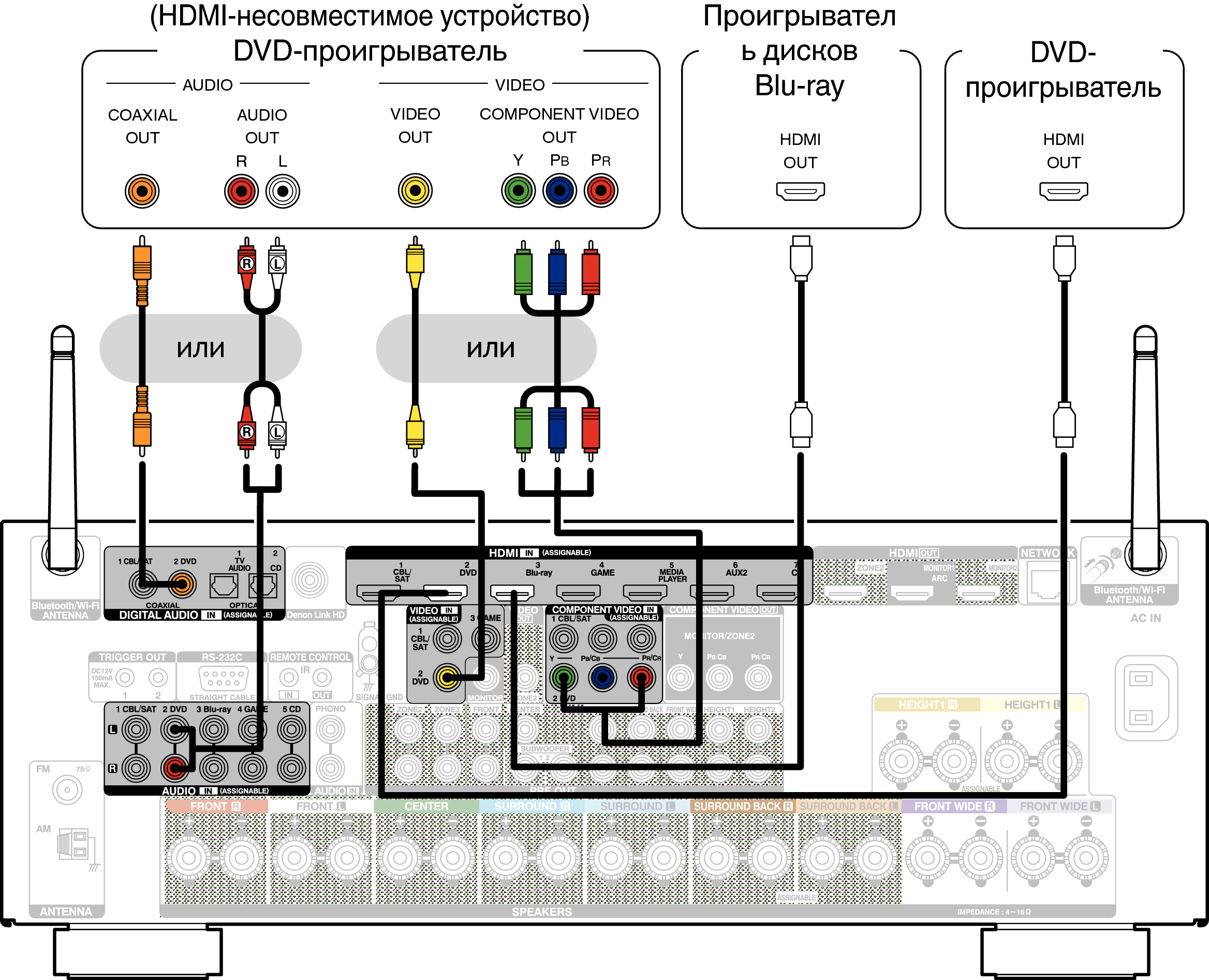 Подключение DVD-проигрывателя или проигрывателя дисков Blu-ray