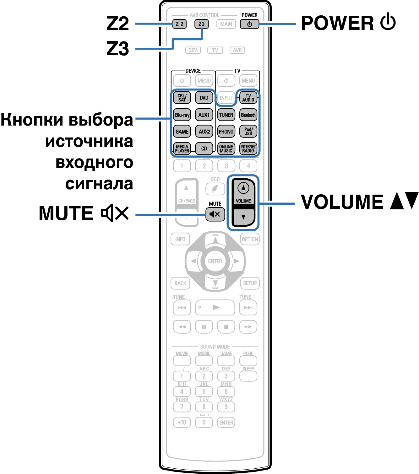 Для выполнения операций управления с основным блоком нажмите ZONE2 SOURCE или ZONE3 SOURCE. При каждом нажатии ZONE2 SOURCE или ZONE3 SOURCE изменяется источник входа.