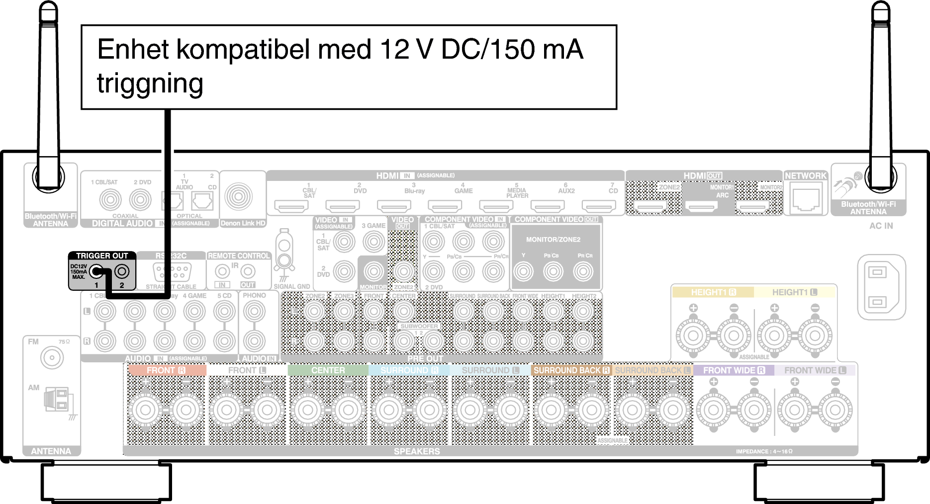När du ansluter en enhet med TRIGGER IN-anslutning kan du slå på eller sätta enheten i standbyläge via länkad styrning från den här enheten.