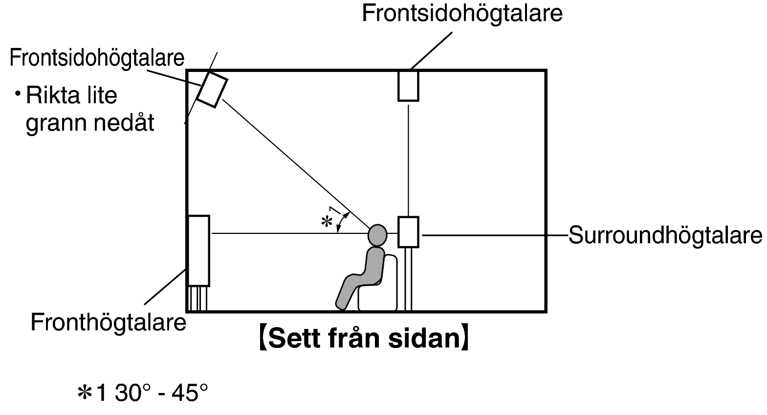 Placera vänster och höger SURROUND-högtalare på lika avstånd till vänster och höger om avlyssningspositionen. Om du inte har bakre surroundhögtalare ställer du surroundhögtalarna något bakom avlyssningspositionen.