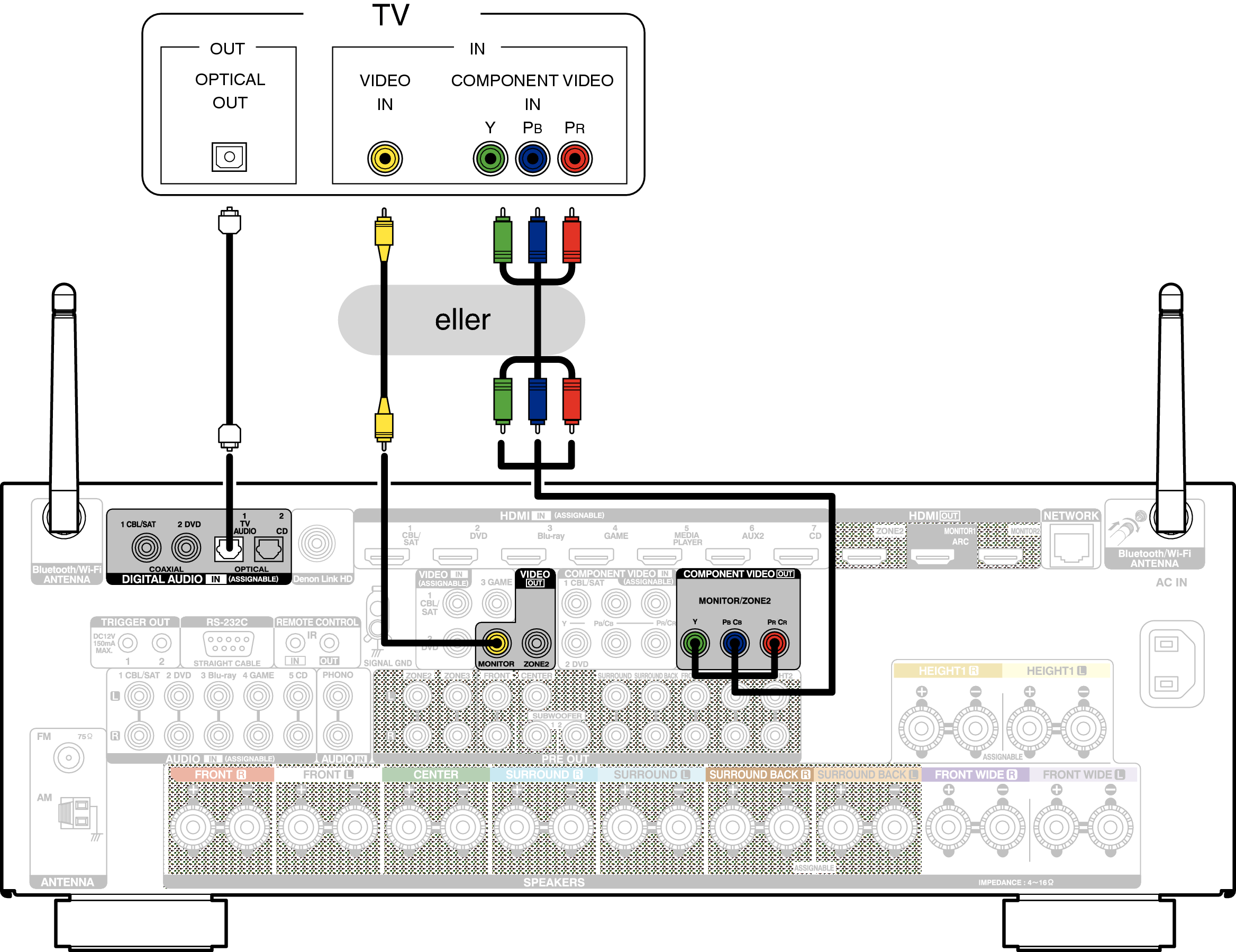 Använd en Komponentvideo- eller videokabel för att ansluta TV:n till den här enheten.
