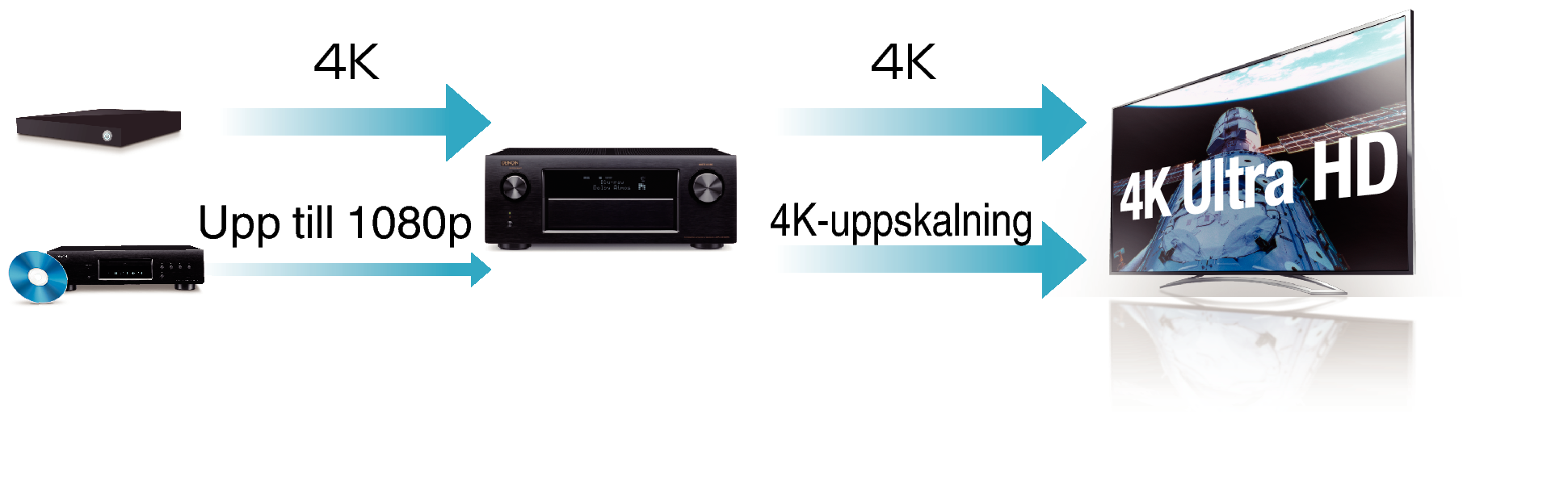 Om 4K Ultra HD (High Definition) används kan hastigheten för videosignaler för ingång/utgång komma upp i 60 bilder per sekund (60p) . Om du är ansluten till 4K Ultra HD och har en TV som klarar av 60p-videosignal kan du uppleva den realism som enbart kan fås med högupplösta bilder, oavsett hur snabb filmen är.