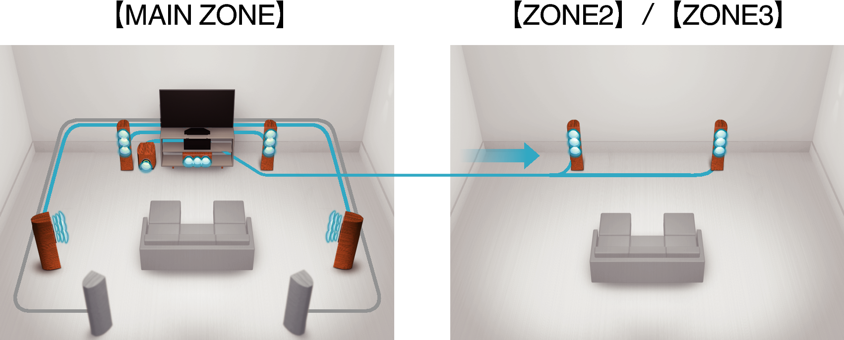 I ZONE2-utgången för flera rum medföljer en HDMI-utgång som gör att du kan lyssna på en annan A/V-källa i det rummet samtidigt som ett annat program spelar i huvudrummet.